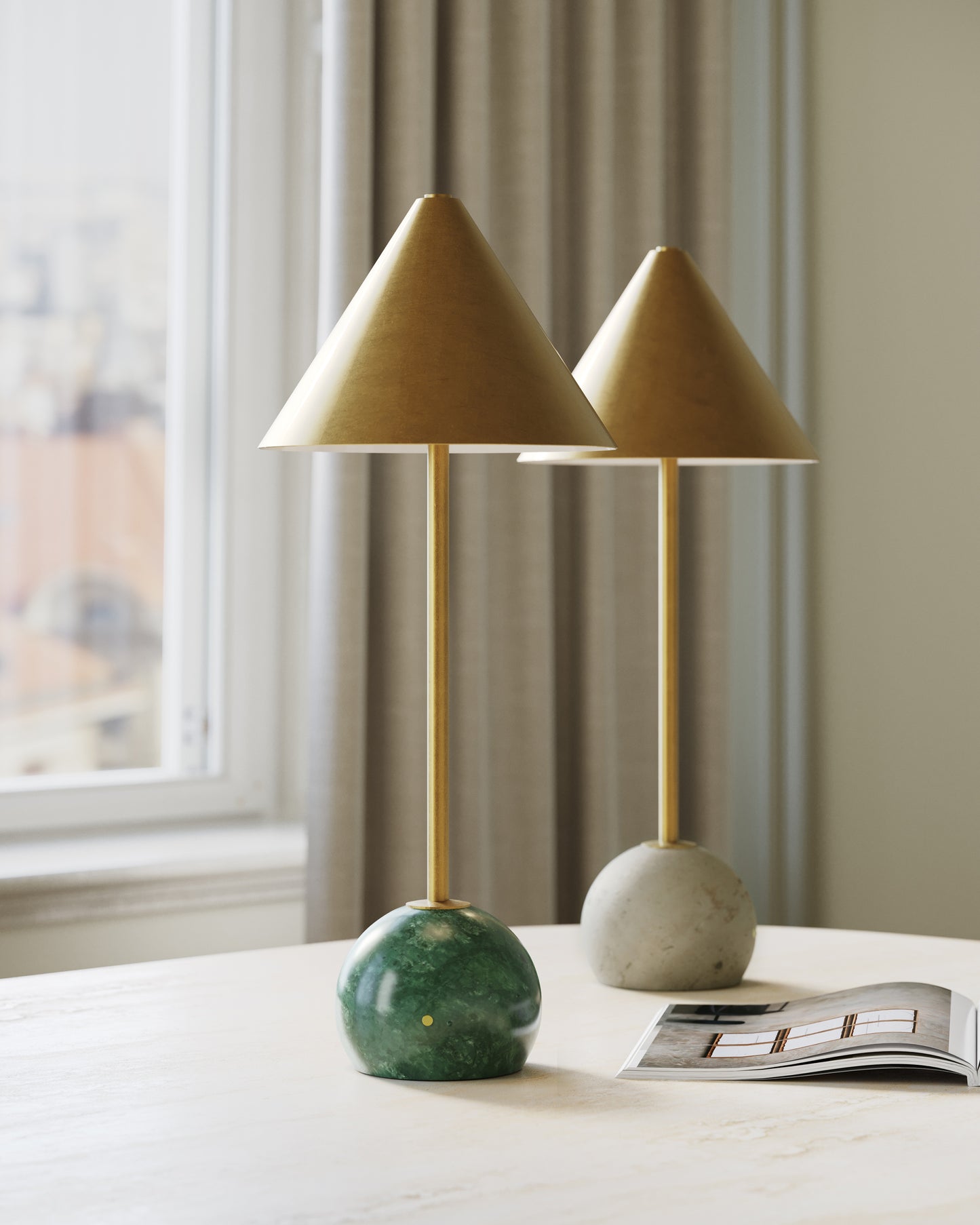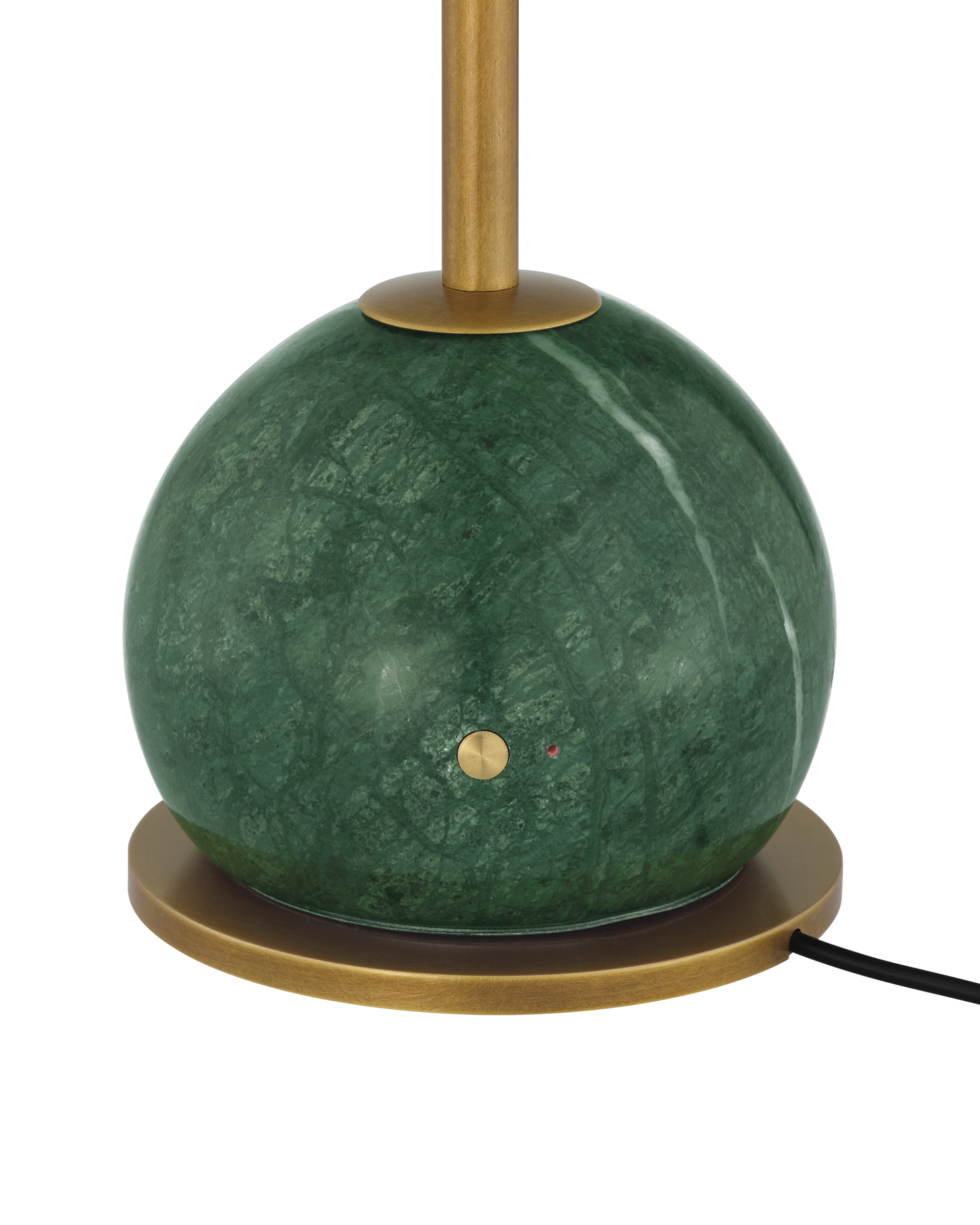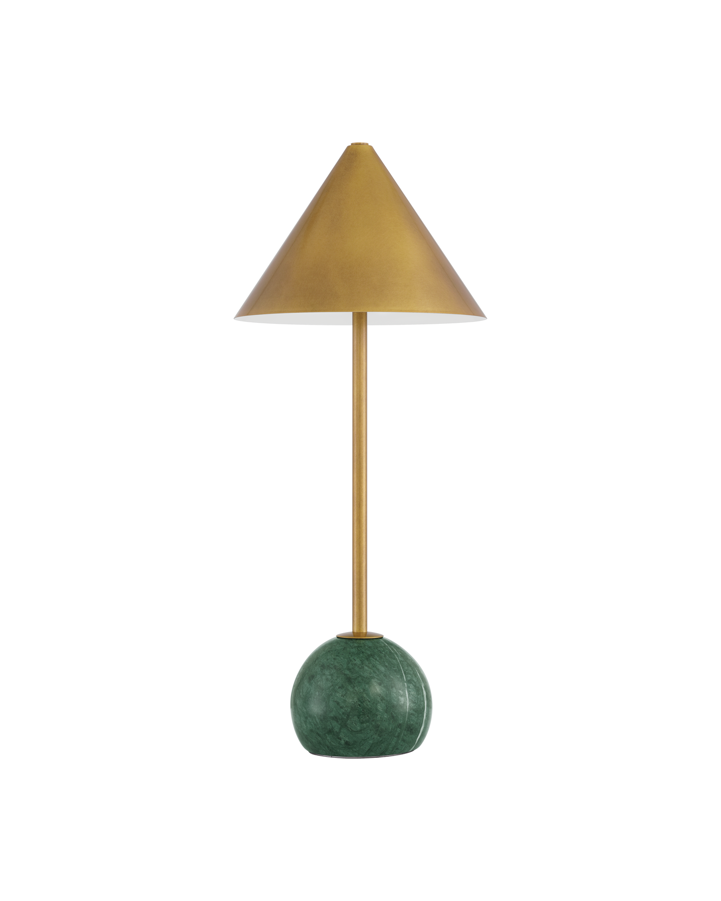 The Journey Green & Brass Cordless Table Lamp packs a fashionable punch for a portable design. The antique brass finish on the long thin stem and the cone-shaped shade brings it a subdued sophisticated gleam, while the green marble globeon the bottom anchors the piece. At less than 20 inches tall, the gold lamp has an on and off button and a battery-life indication light that alerts when it is time to recharge on the side of the base.