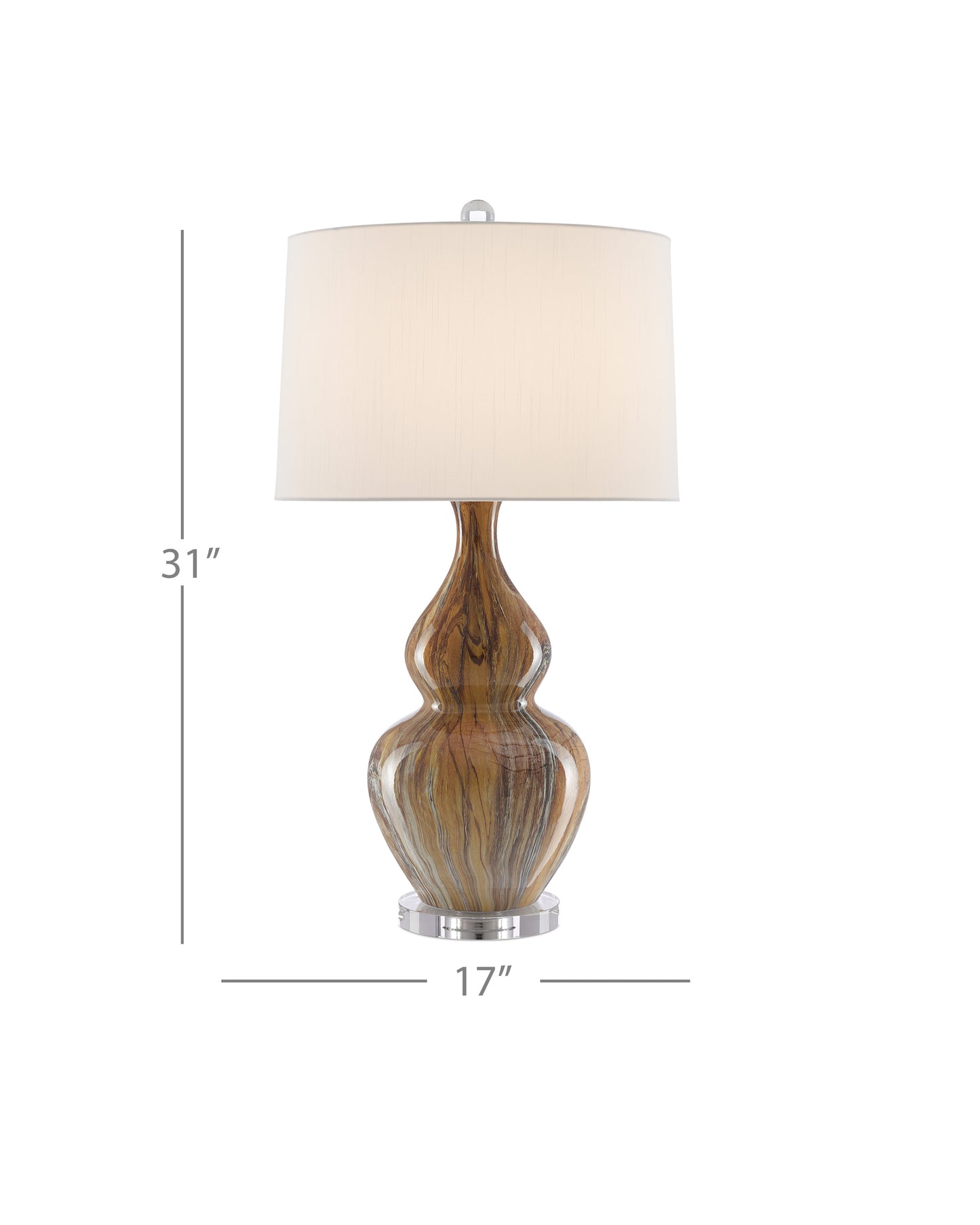 The Kolor Brown Table Lamp has a buxom gourd shape made of porcelain with a playful brushstroke pattern. The richness of the brown, the optic crystal base and finial, and the off-white linen shade are among the attributes that make the brown lamp so special.