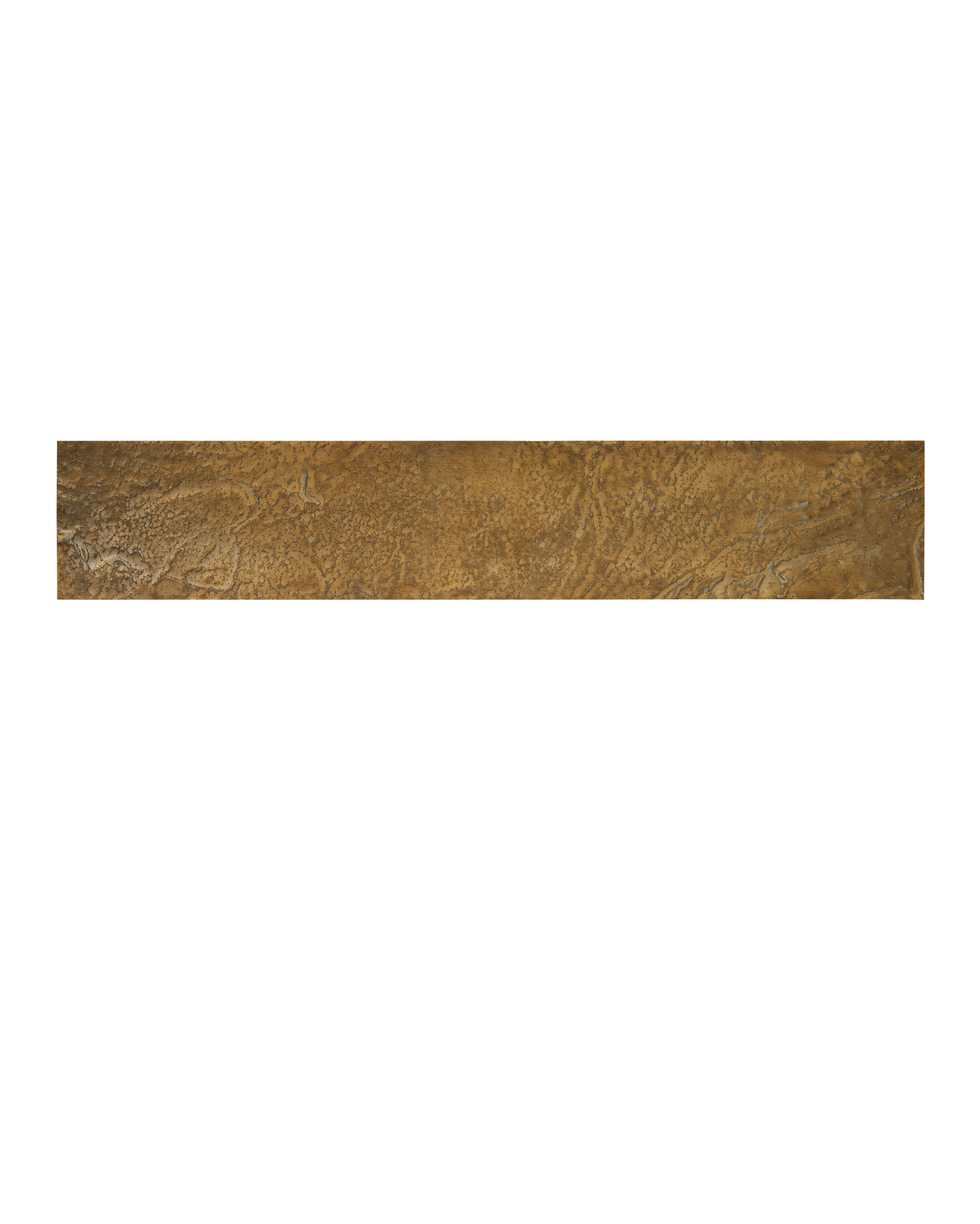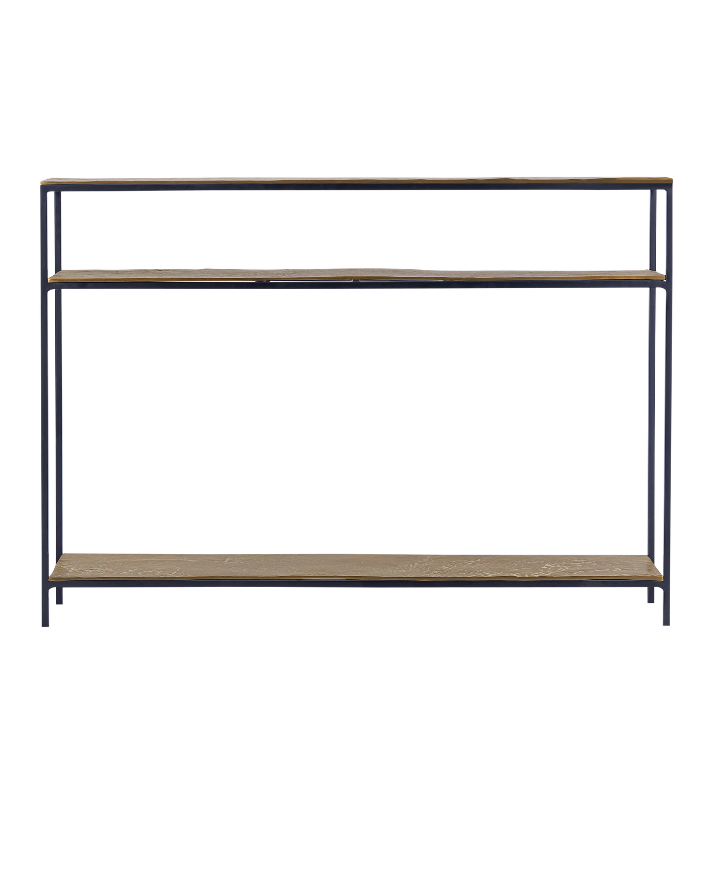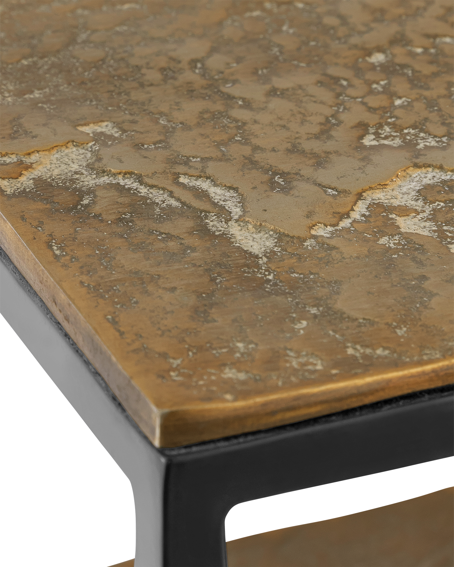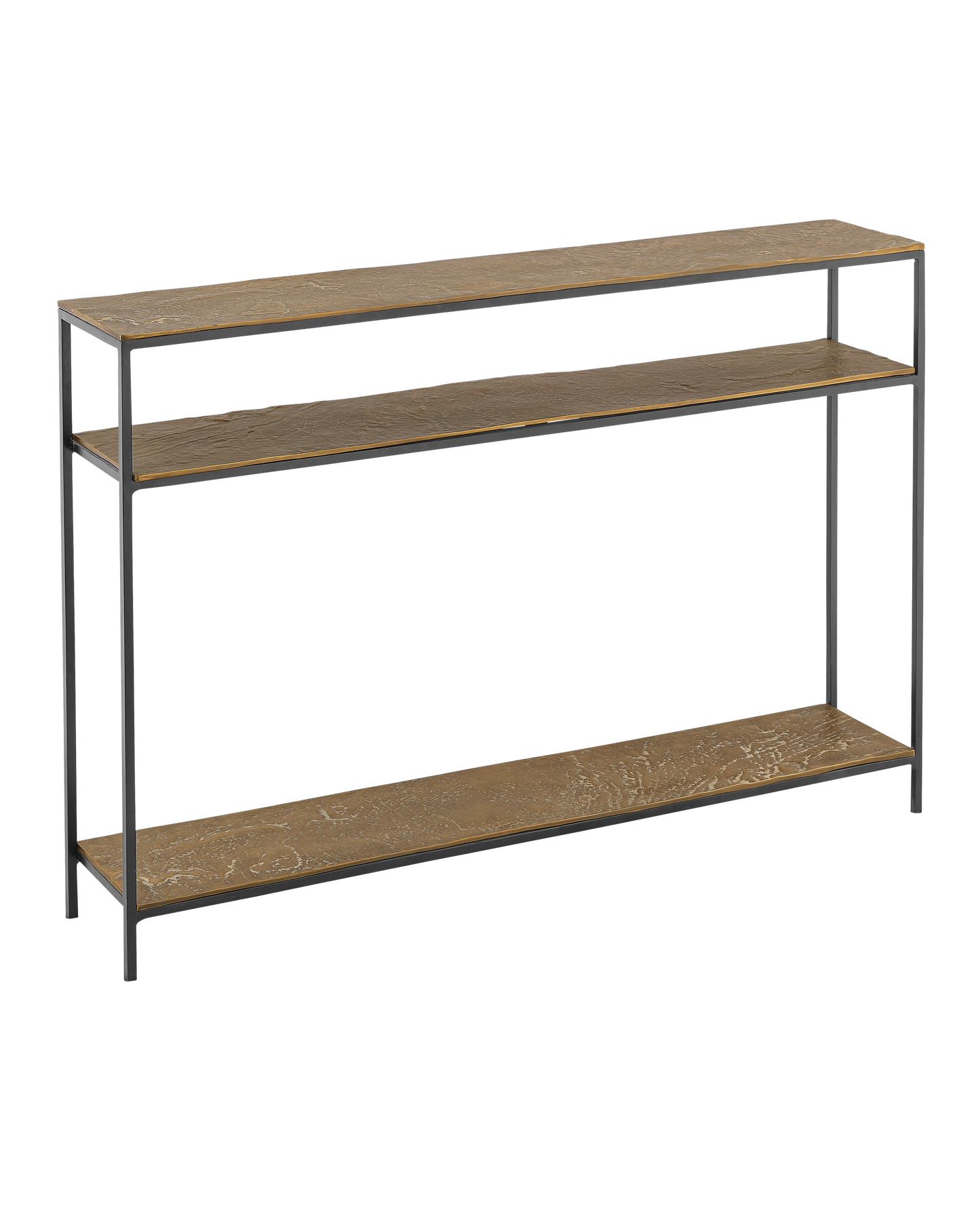 The Lathi Brass Console Table is narrow, measuring just 8 inches deep. The table has a top and two fixed shelves made of cast aluminum in an antique brass finish supported by legs made of black-finished iron. The finish on the shelves of the gold console table has drifts in it that are similar to cerusing on wood.