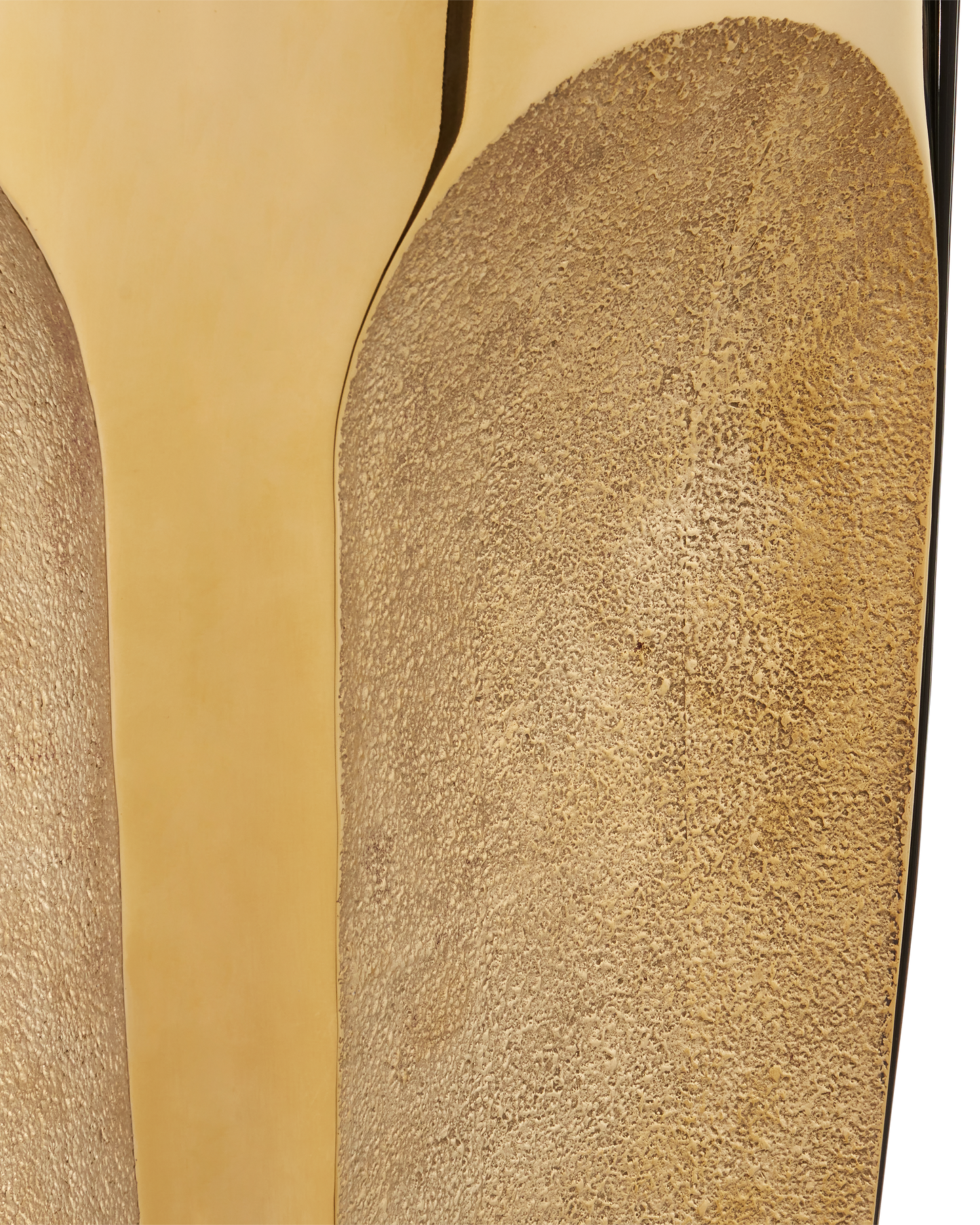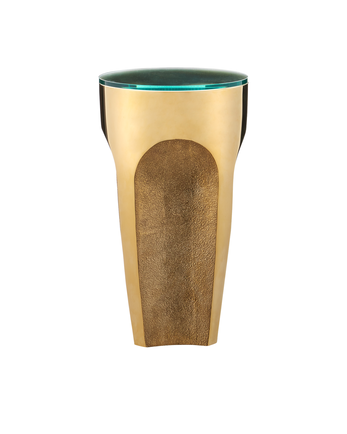 The Lemy Brass Drinks Table is a mix master of shapes and textures. Made of stainless steel in a polished brass finish, the gold drinks table has textural indentions that look as if they have been carved out of the metal. The contemporary piece is topped with a tempered glass top.