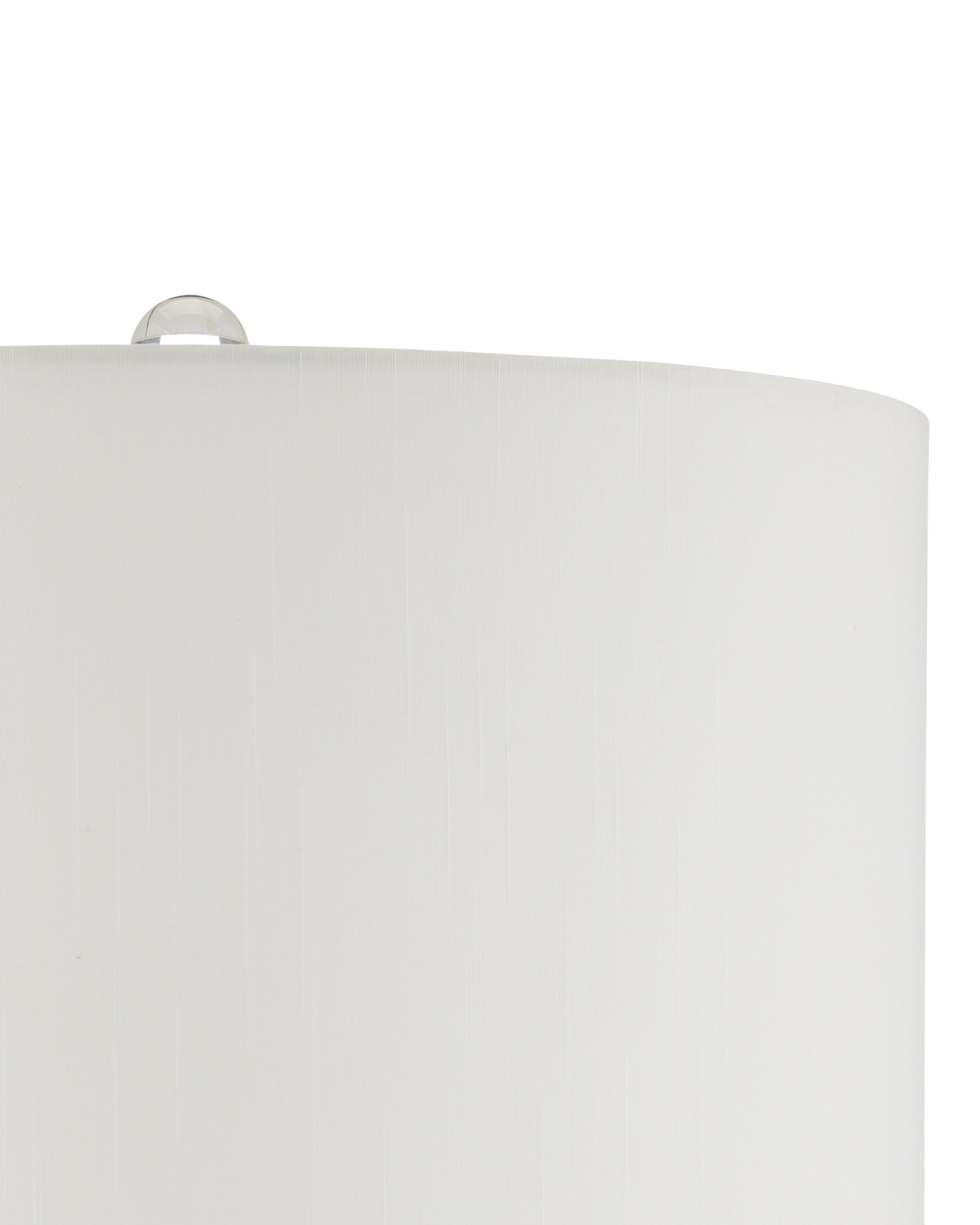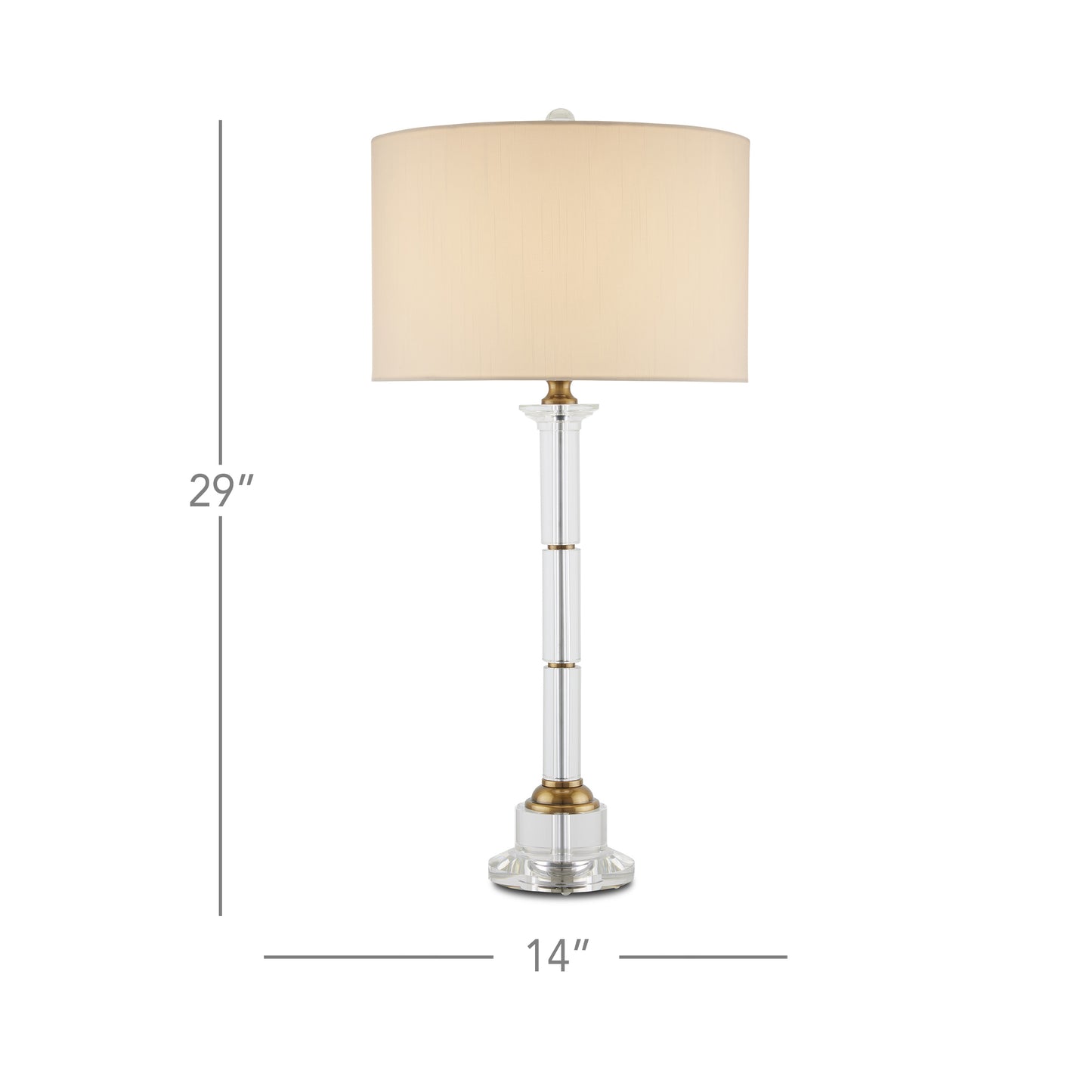The Lothian Table Lamp is a classically shaped design made of clear optic crystal and metal in an antique brass finish. The way the column culminates with an abacus and echinus, and the fact the base reads like a stylobate, the lamp mimics a refined element in architecture. The drum shade is fastened to the lamp with an optic crystal finial.