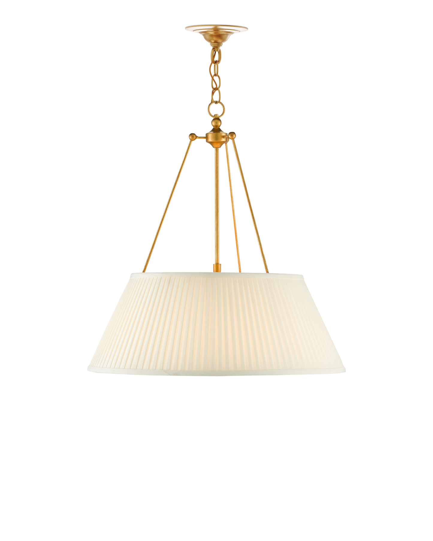 Though the Lytham Pendant has nostalgic references to hanging fixtures from the age of Americana, the length of the frame that extends down to hold the shade brings a fresh, modern feel to this gold pendant. Made of wrought iron in an antique gold leaf finish, the pendant light with pleated shade gleams bright. Adjustable from 32.5" to 100.5" with use of included chain/rod kit/cable. If your space calls for a longer drop, additional chain/rods/cable is available for purchase.