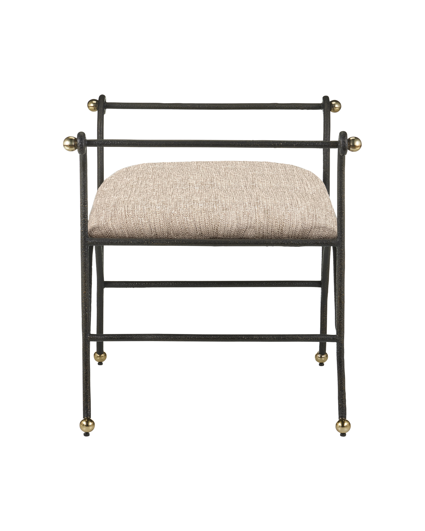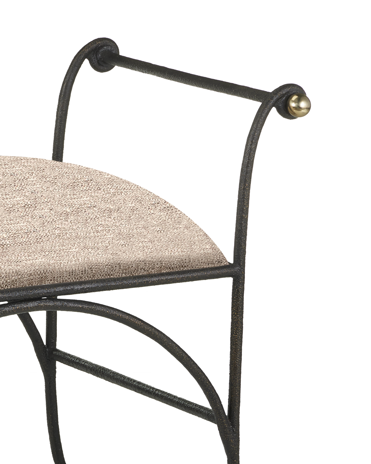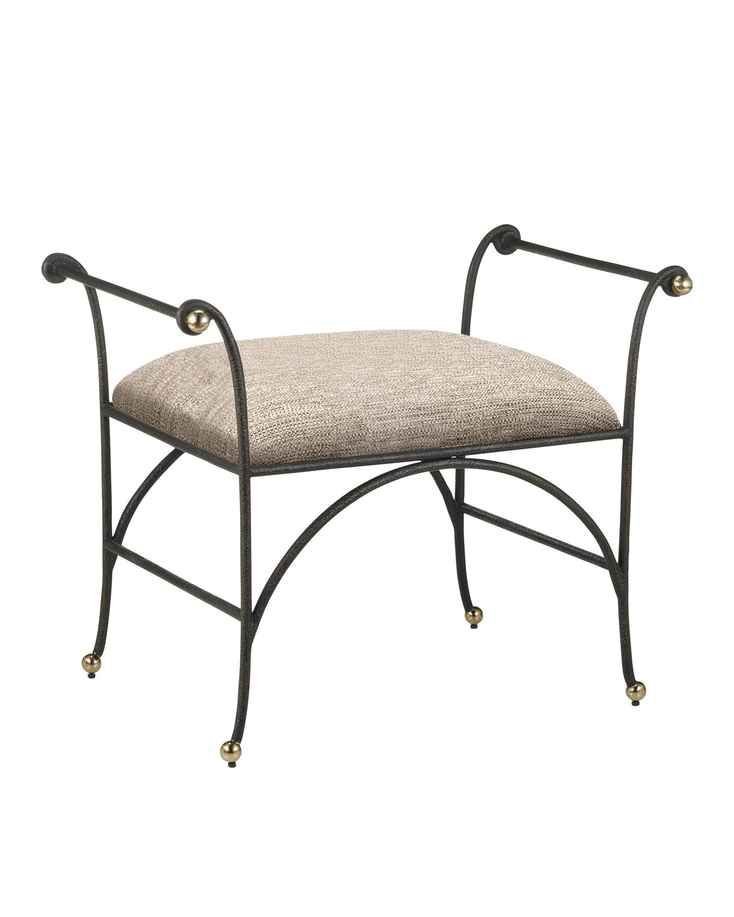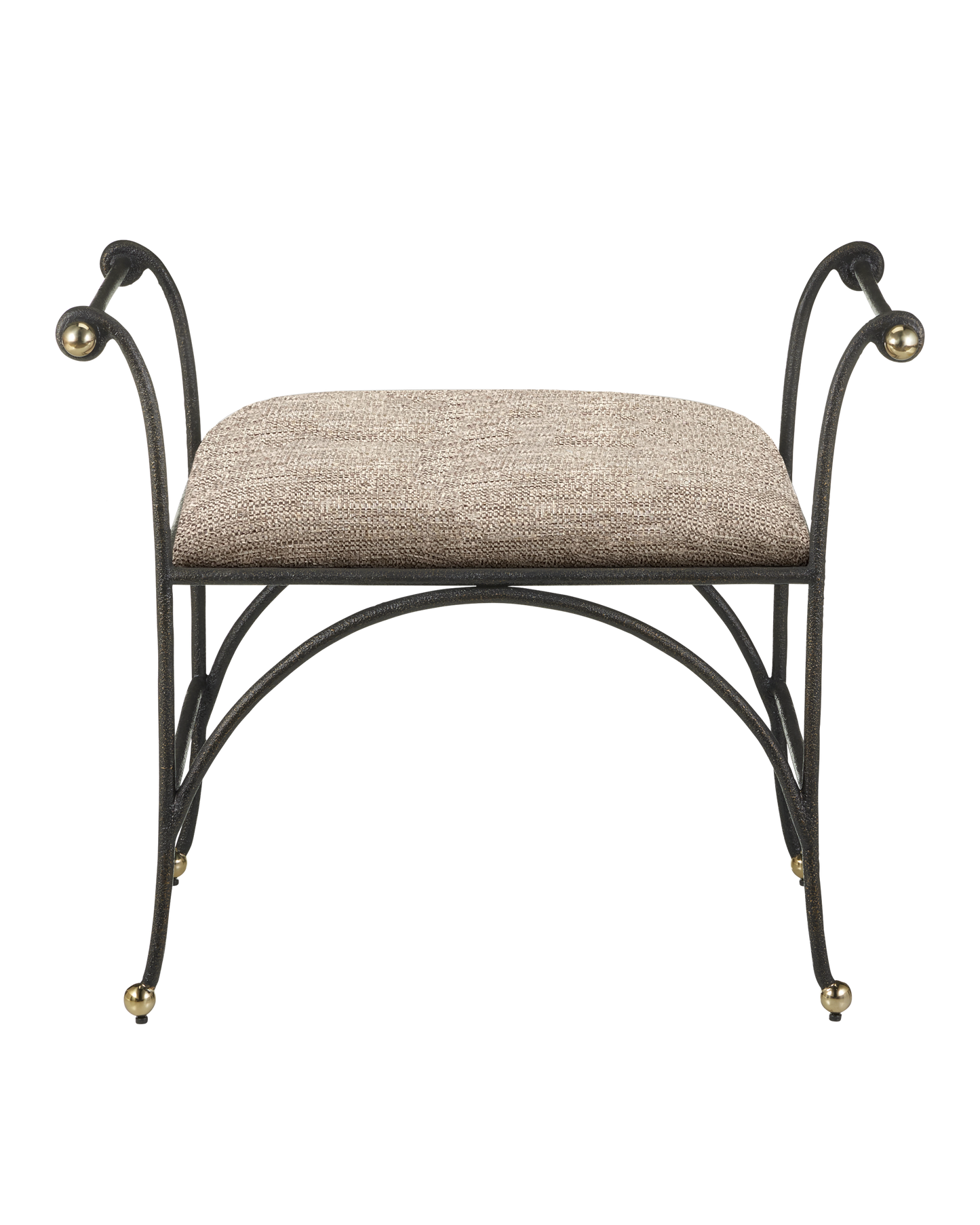 The Mabel Ottoman is a classic design constructed of textured steel, which has a light gold rub that shows through. Special accents are the polished brass stainless steel ball feet and arm details, as well as the way the stretchers arc up toward the seat. The upholstered top is covered in a woven brown-beige performance fabric, and the seat is a generous 22 inches wide.