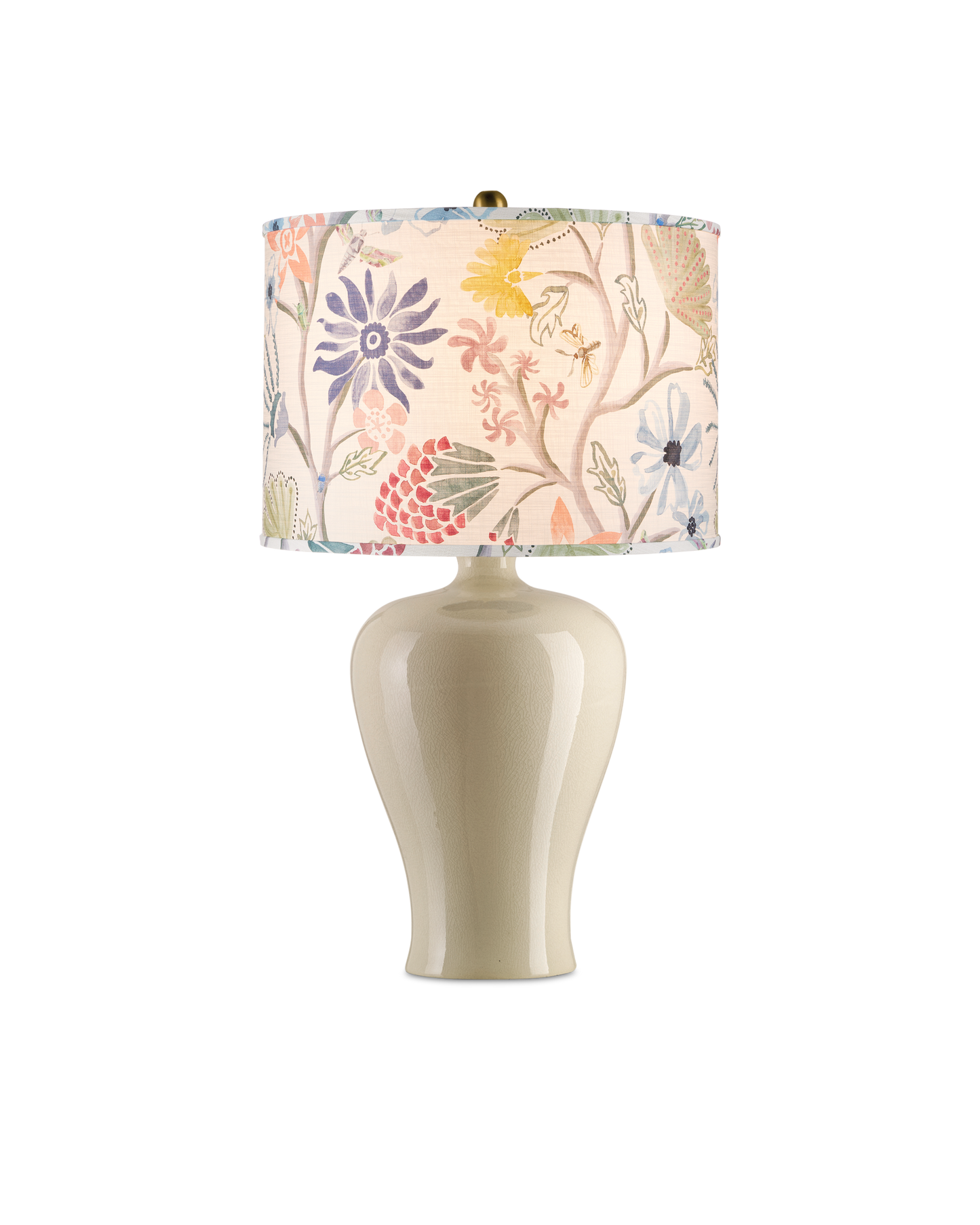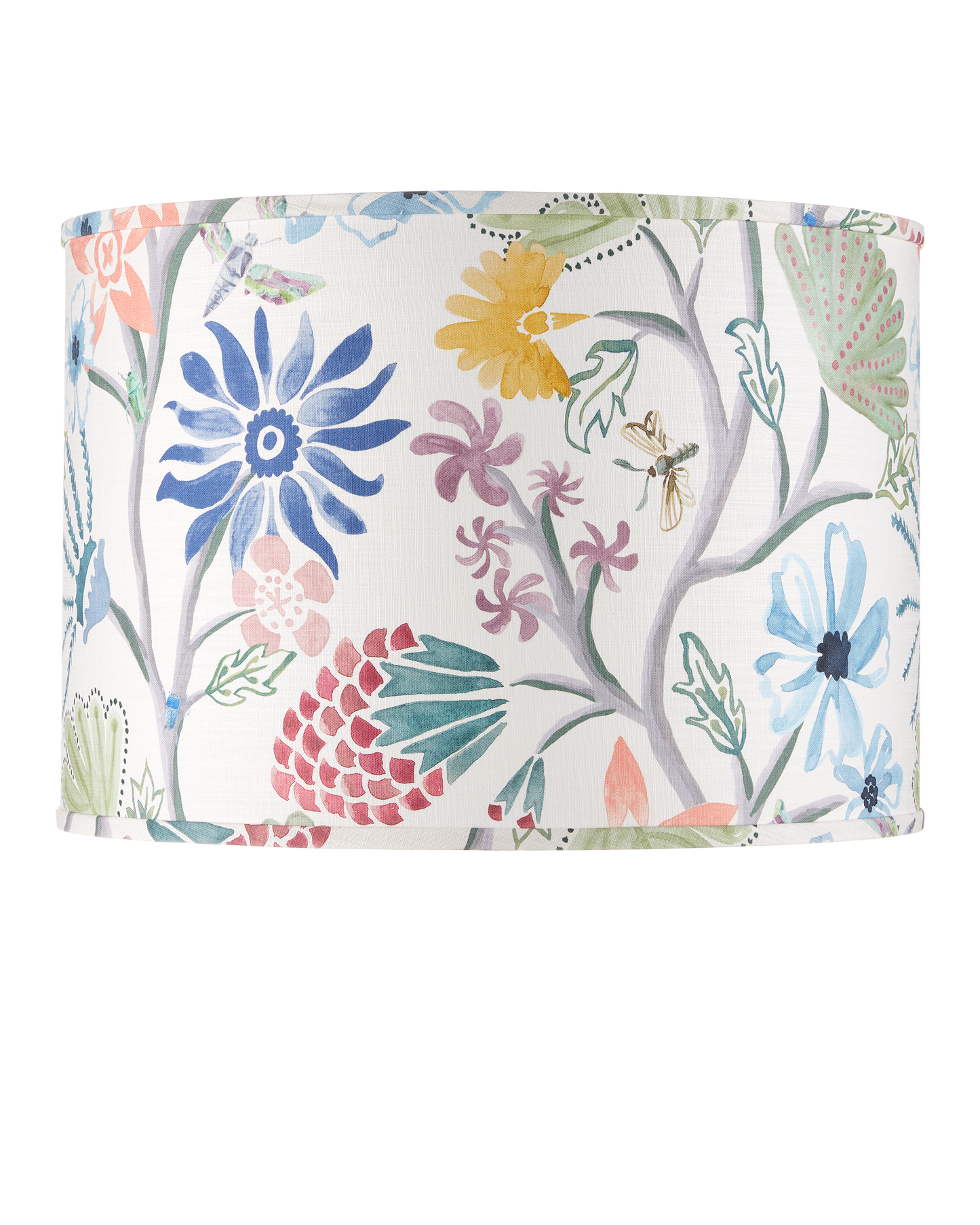 A stenciled pattern of colorful wildflowers dances across this drum-shaped lampshade from design partner Lacefield Designs.
