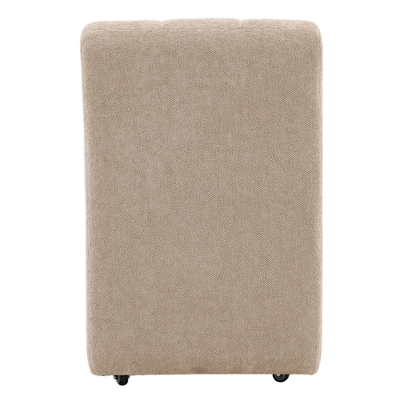 Bold channel tufting and a chunky silhouette give this armless accent chair a sculptural presence, wrapped in a warm camel-toned boucle. Hidden casters offer effortless mobility, making it as functional as it is fashion-forward.