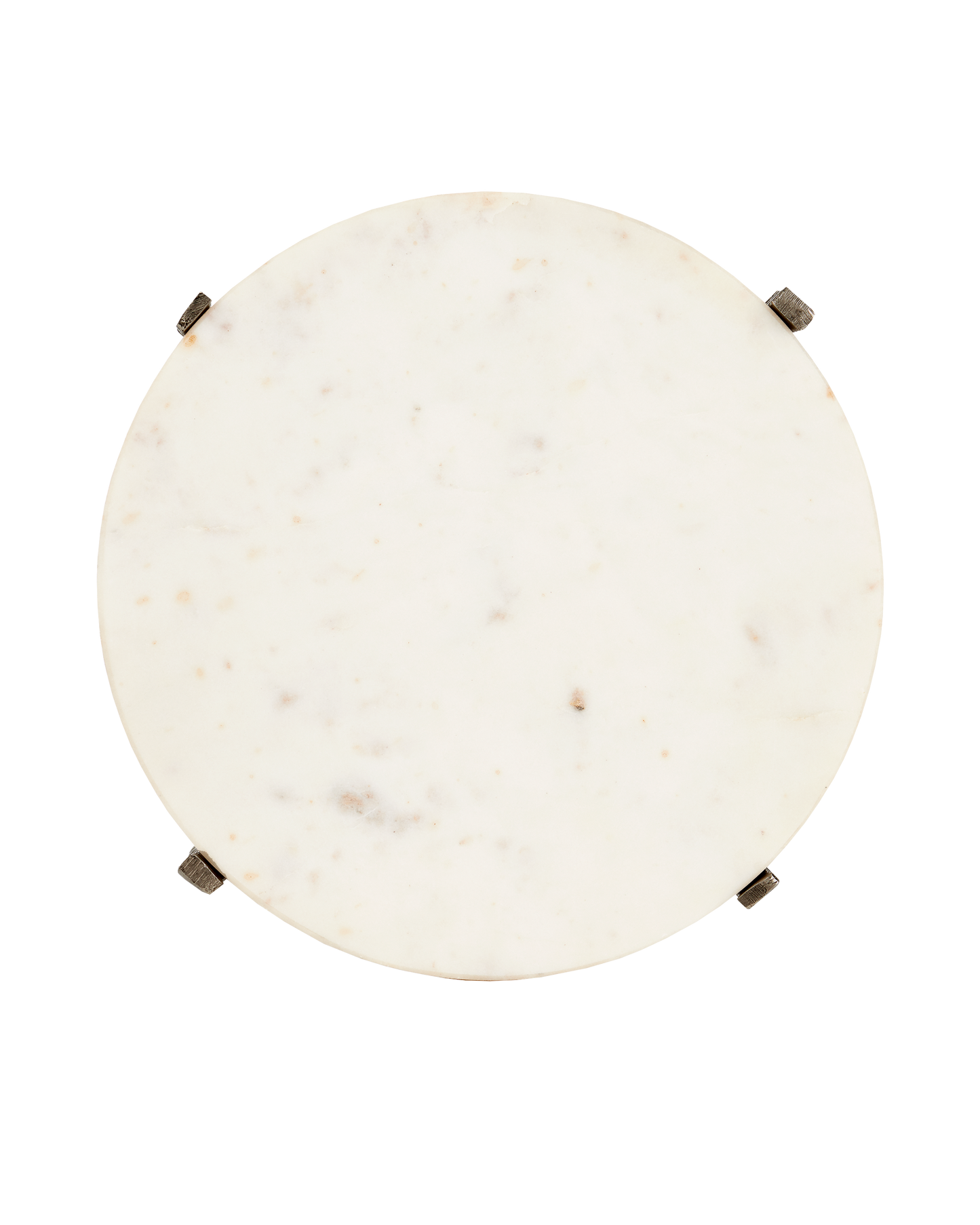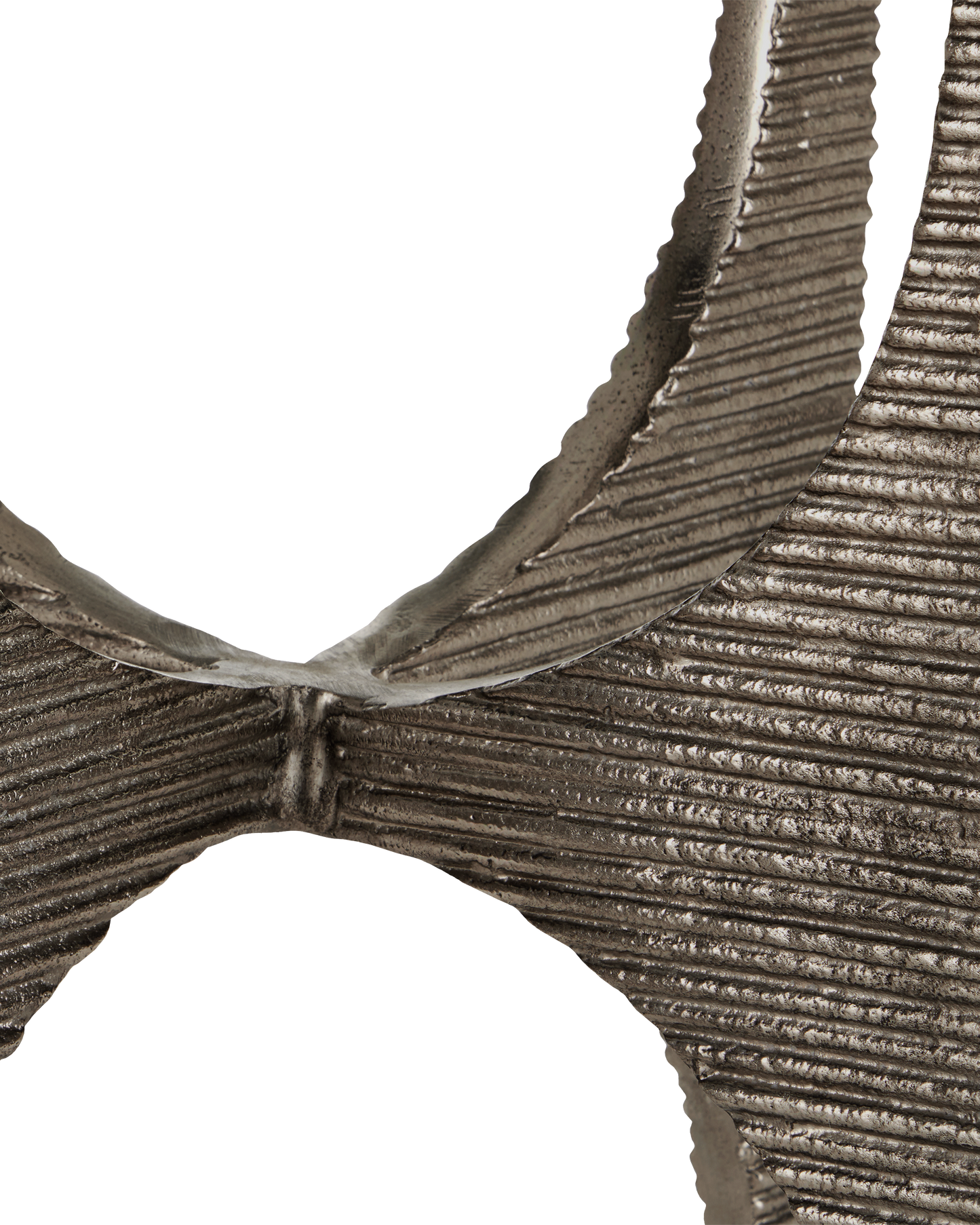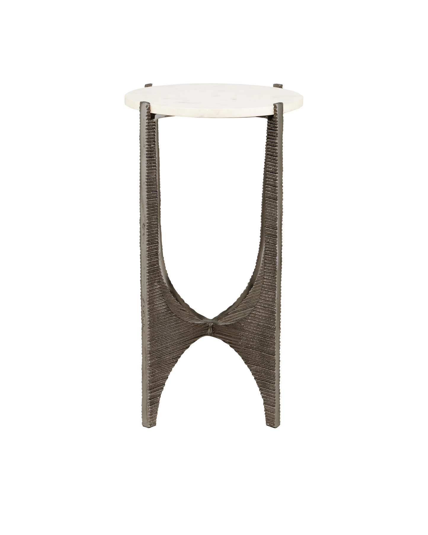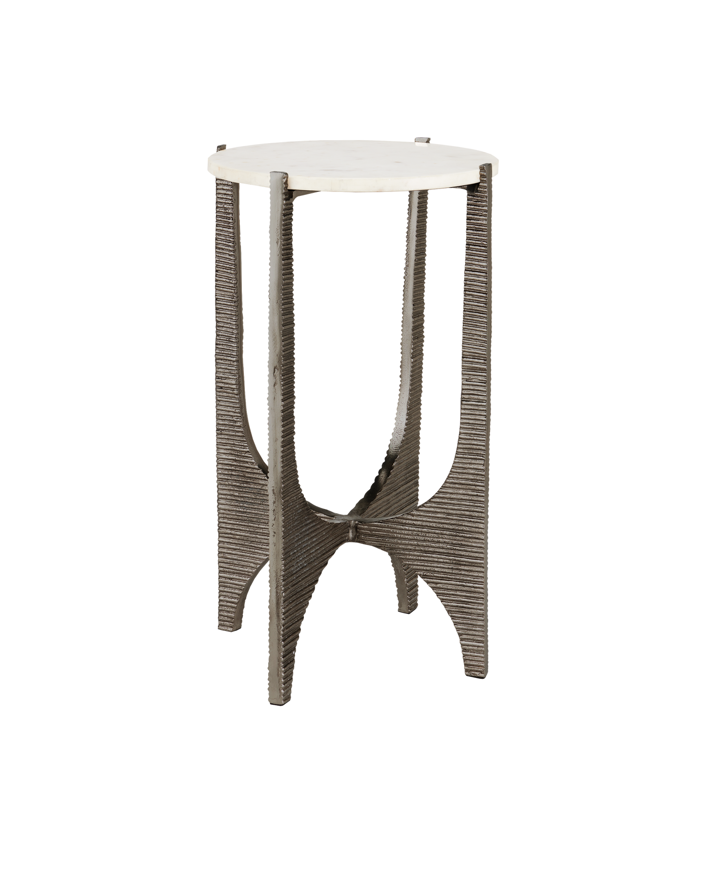 Serious about its ability to wow, the Micha Marble Accent Table has lines pressed into its metal surfaces that bring it a dynamic texture and a sense of movement. Made of textured cast aluminum in an antique nickel finish, the base is handmade so the striations on the legs and base will vary slightly. The silver accent table holds the white stone top as brilliantly as it shines, the removable disc fitted with felt pads on the bottom. The way the upper and lower u-shaped negative spaces intersect introduces added character to the design.