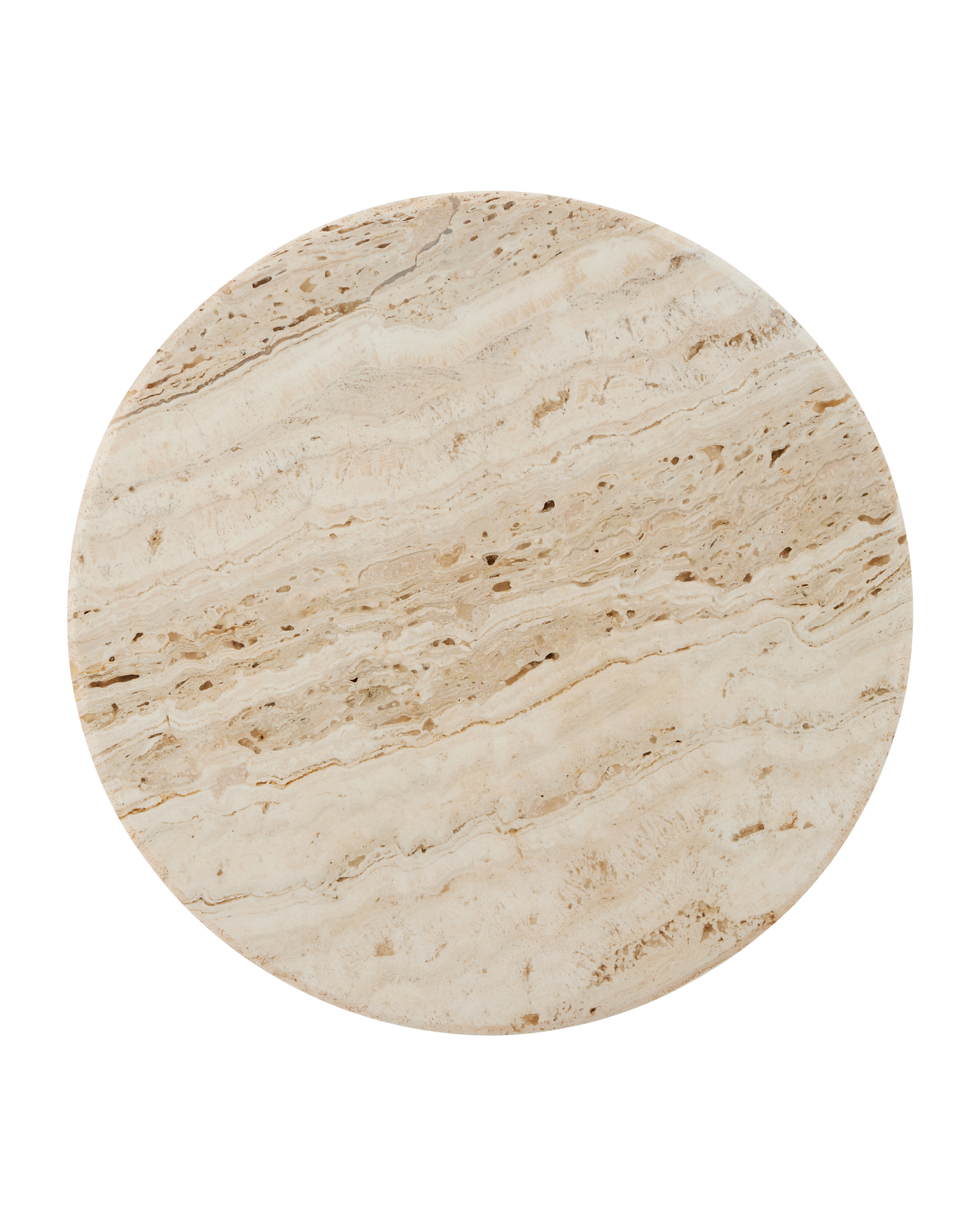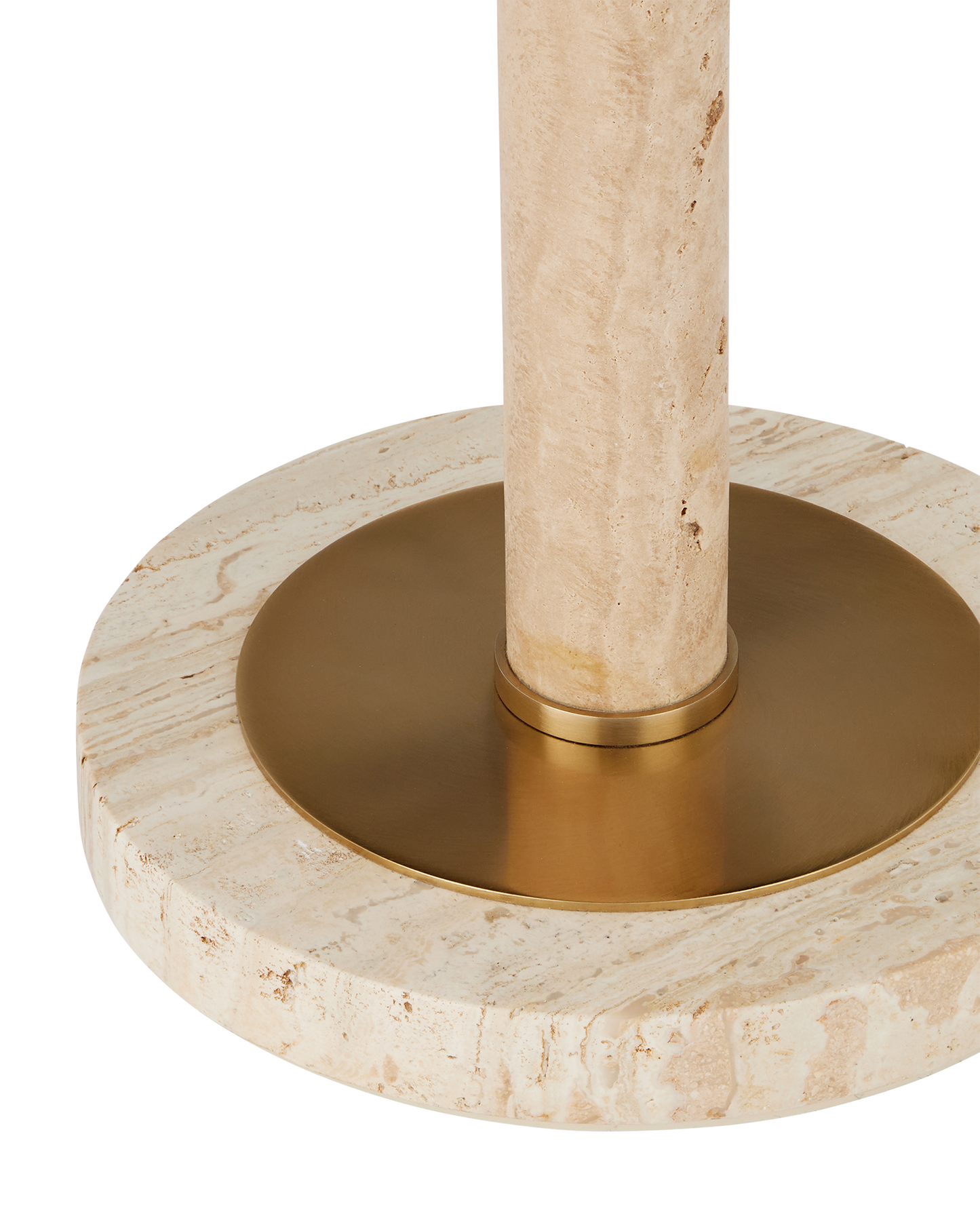 Made of travertine and brass in a polished brass finish, the Miles Travertine Accent Table has a telescoping personality. The interplay of metal and stone is a sophisticated aspect of this design, as the travertine column at the bottom has been drilled so the metal slices through it. The warmth of the finish on the metal draws out the darker veining in the natural material.