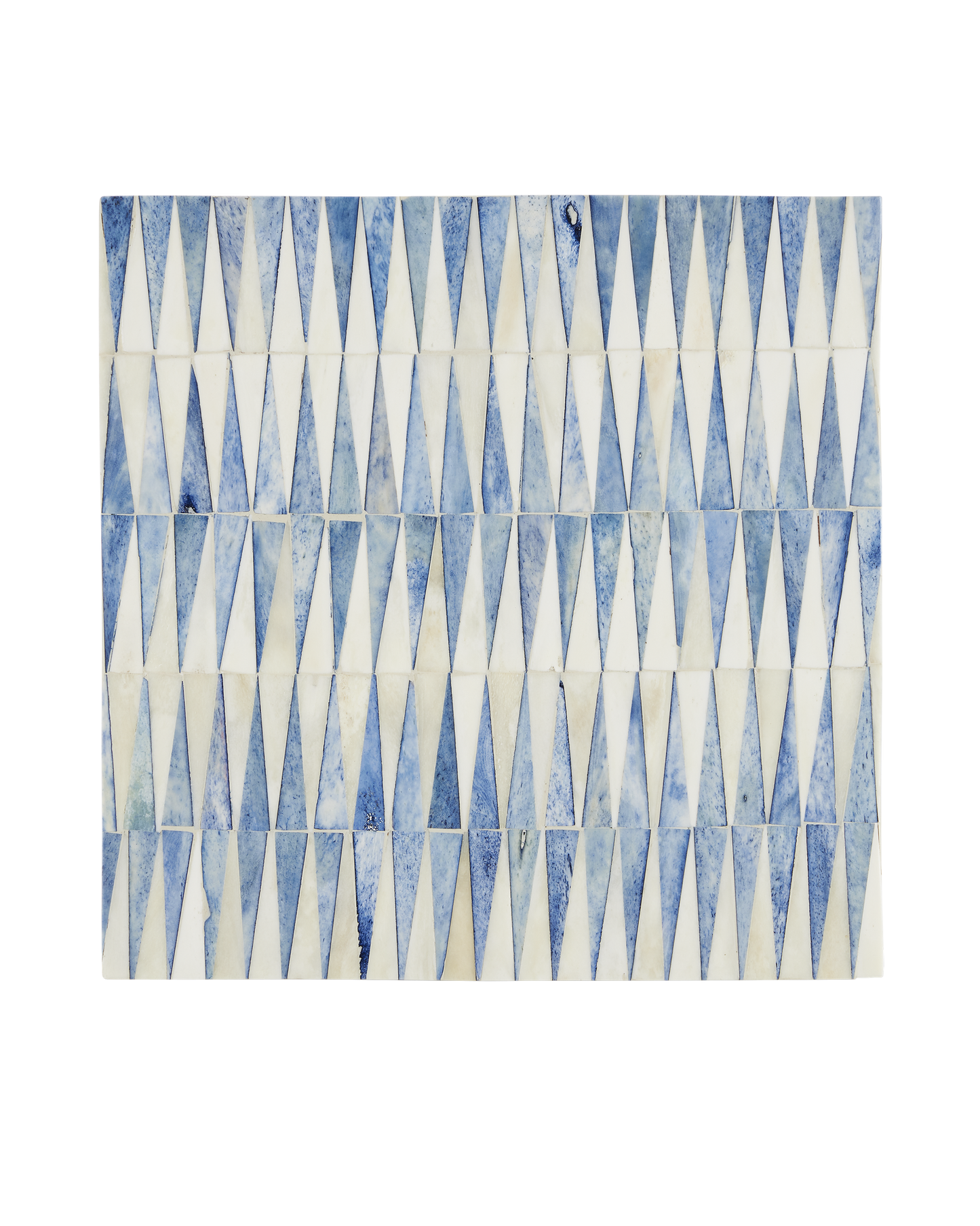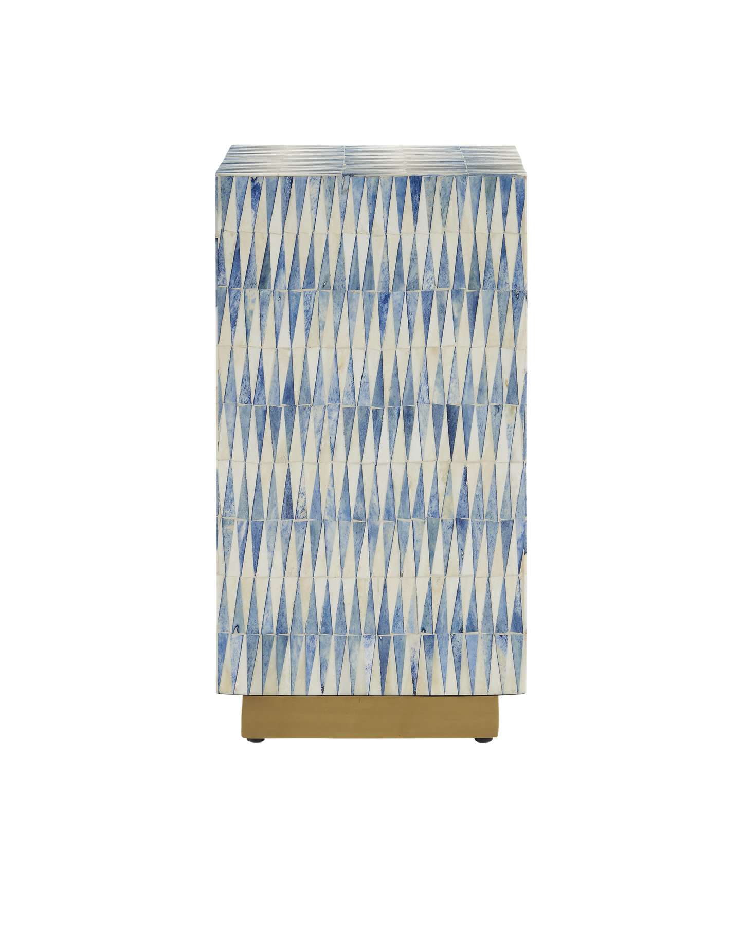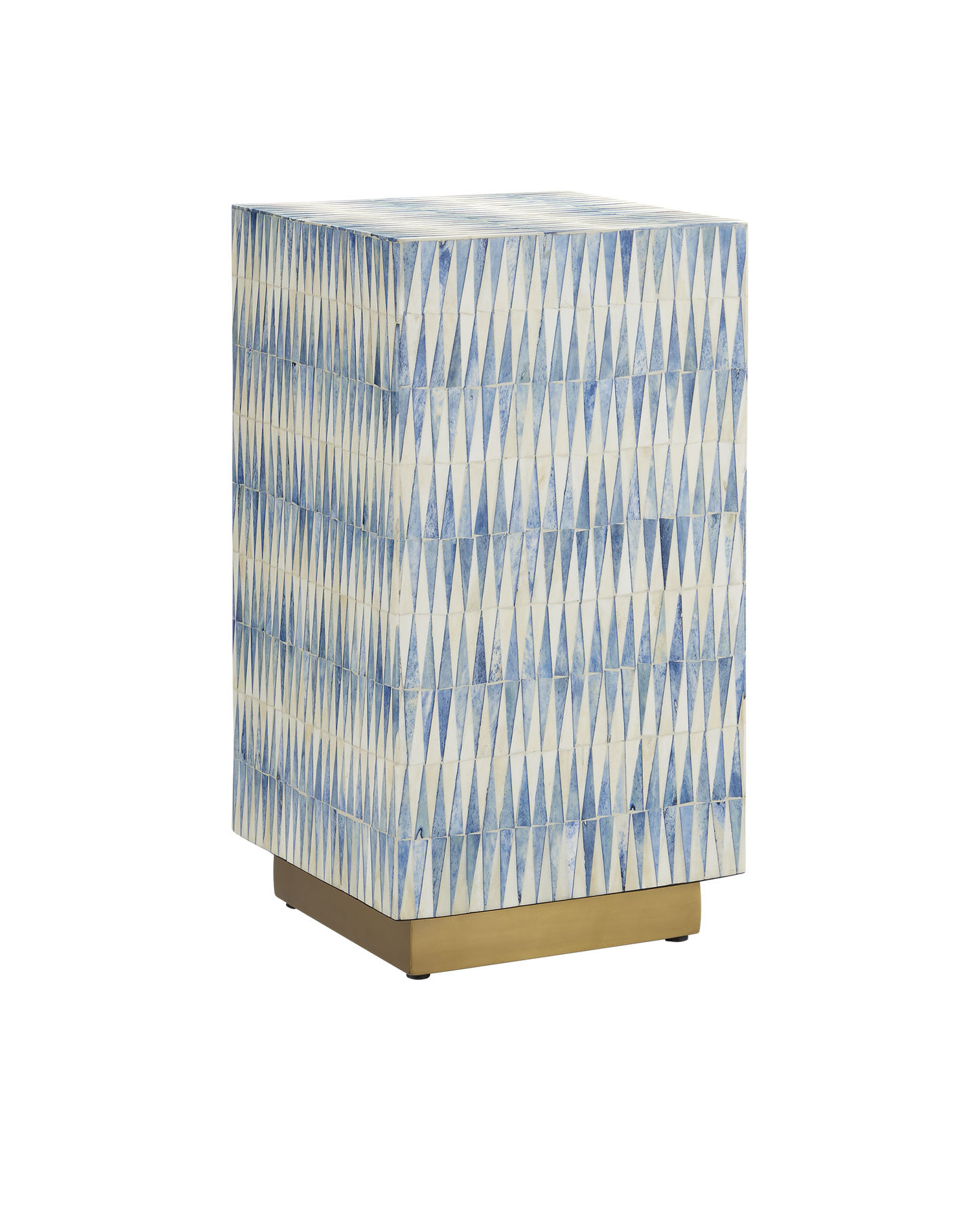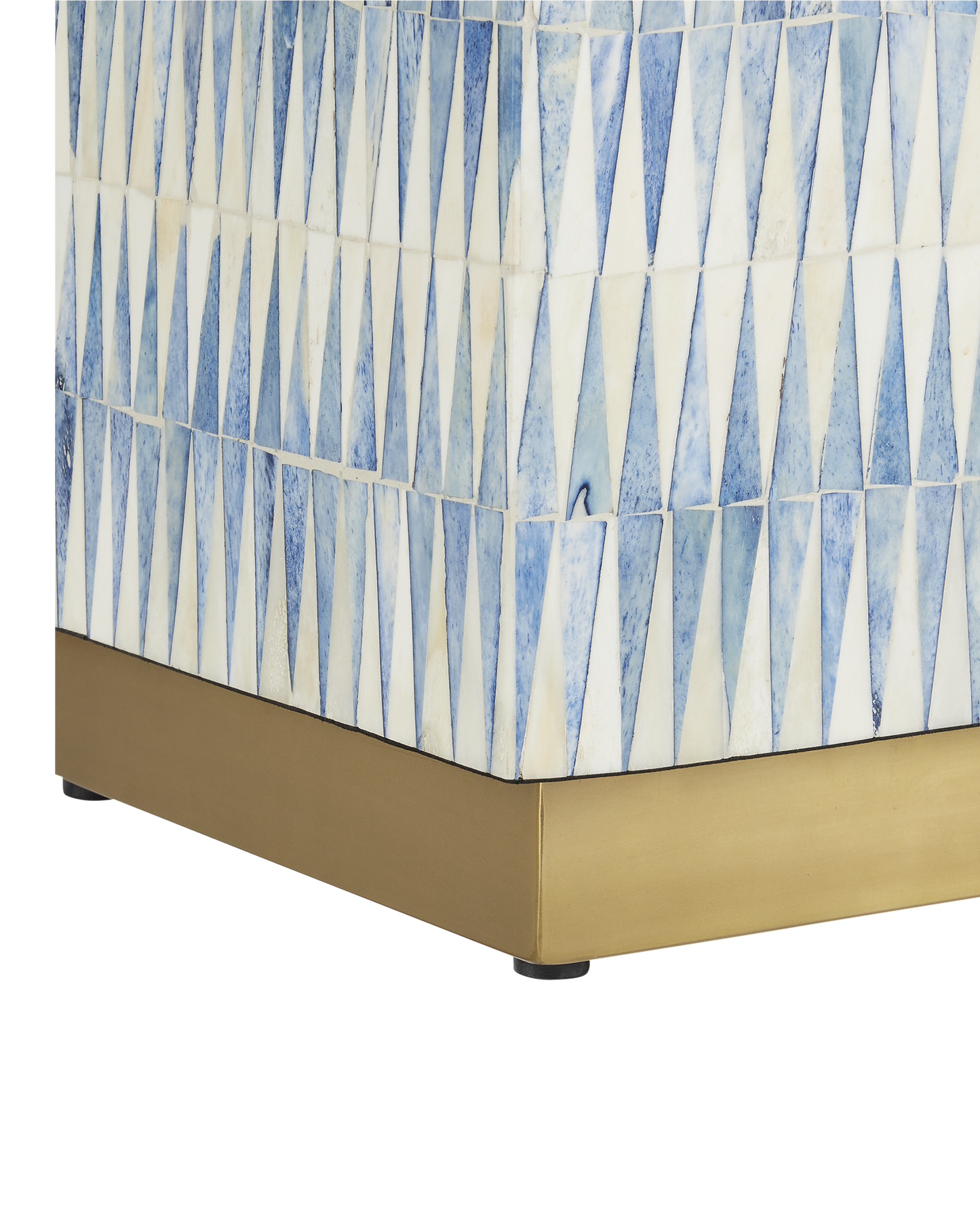 The Nadene Blue & White Accent Table is a decorative side table made of alternating colors of bone. The jagged pattern is created when blue and ivory bone are hand-applied to the surface, making the blue occasional table an artisanal accent that packs a textural punch. This complex composition sits atop a brass plinth base that adds to its sophisticated profile.
