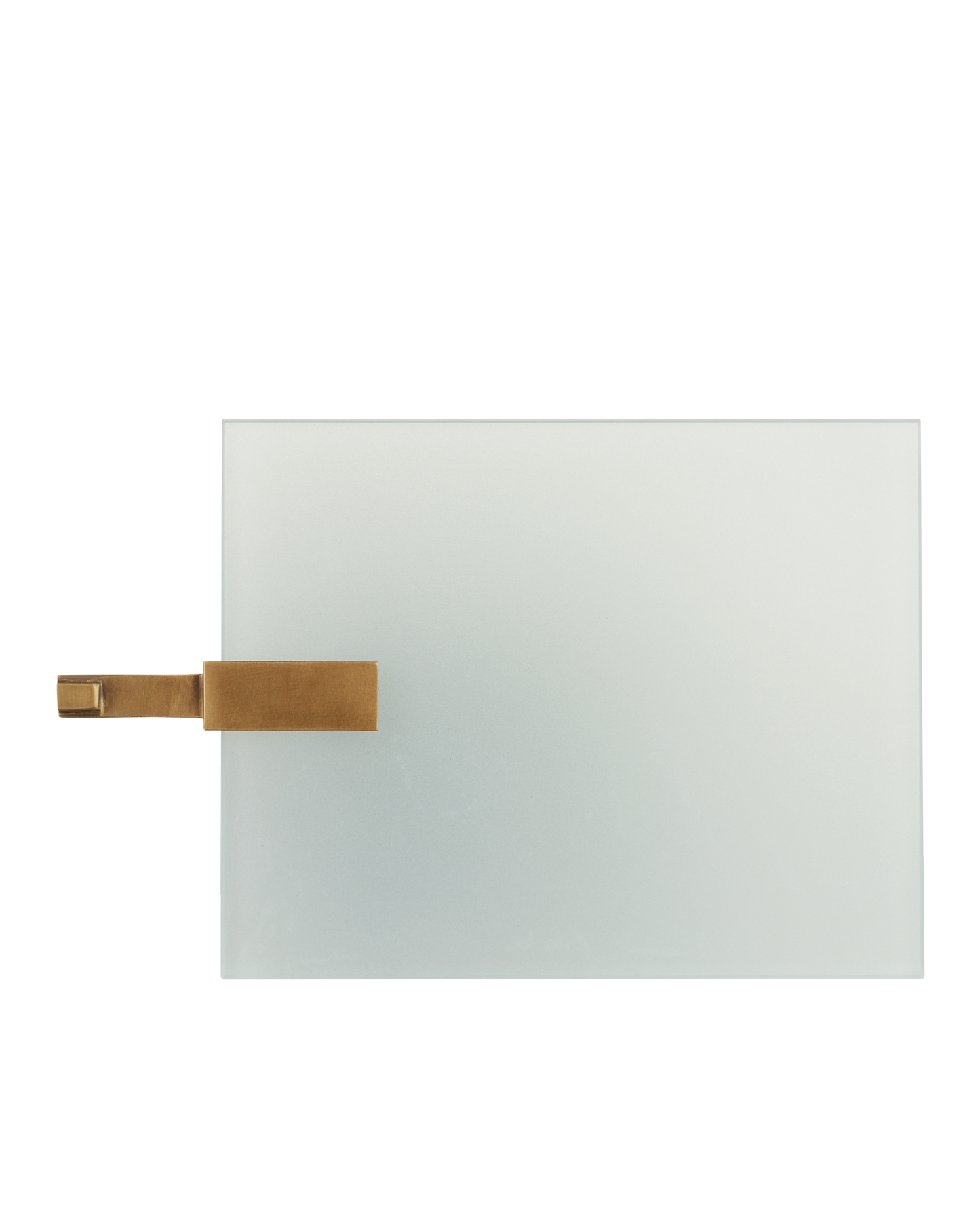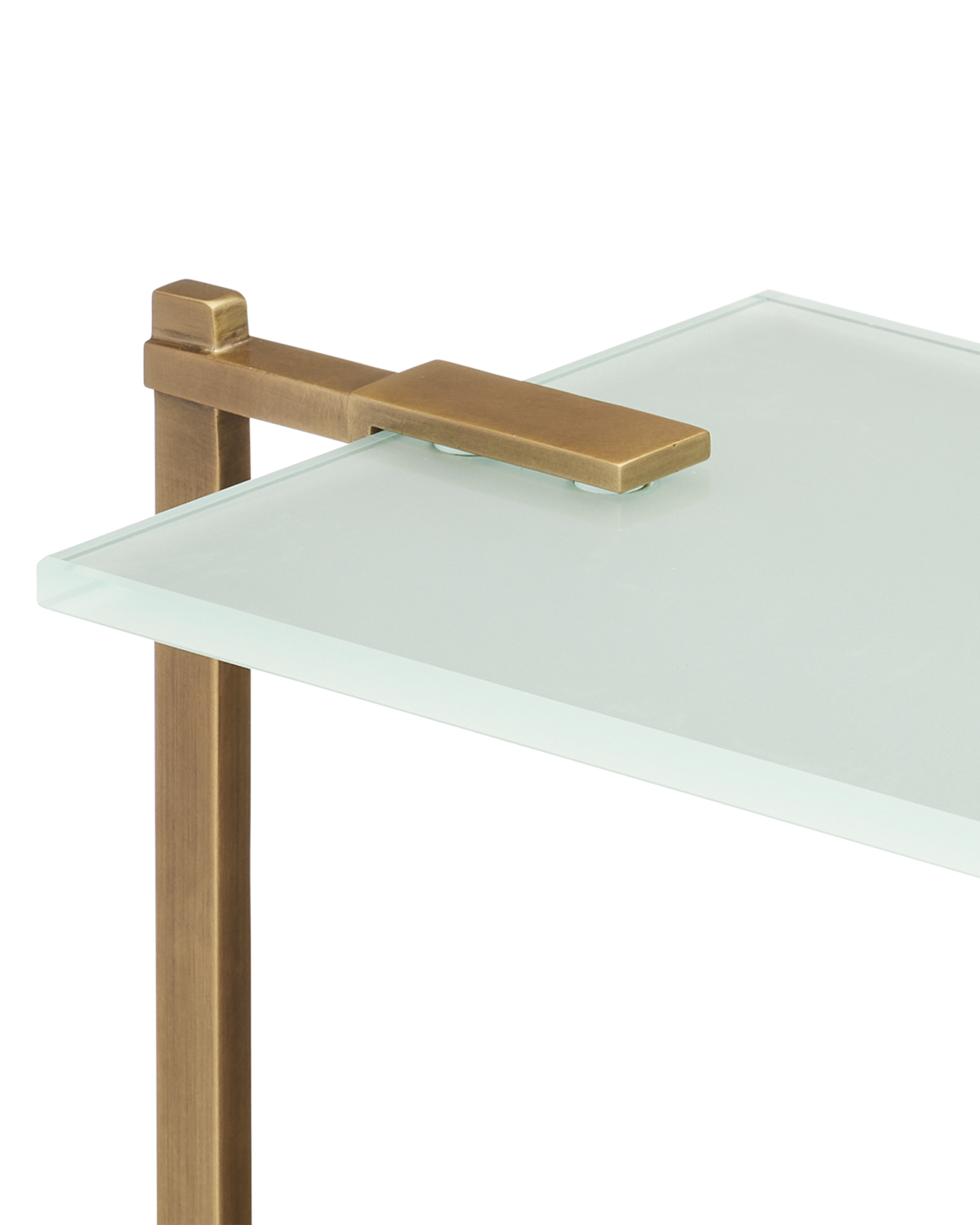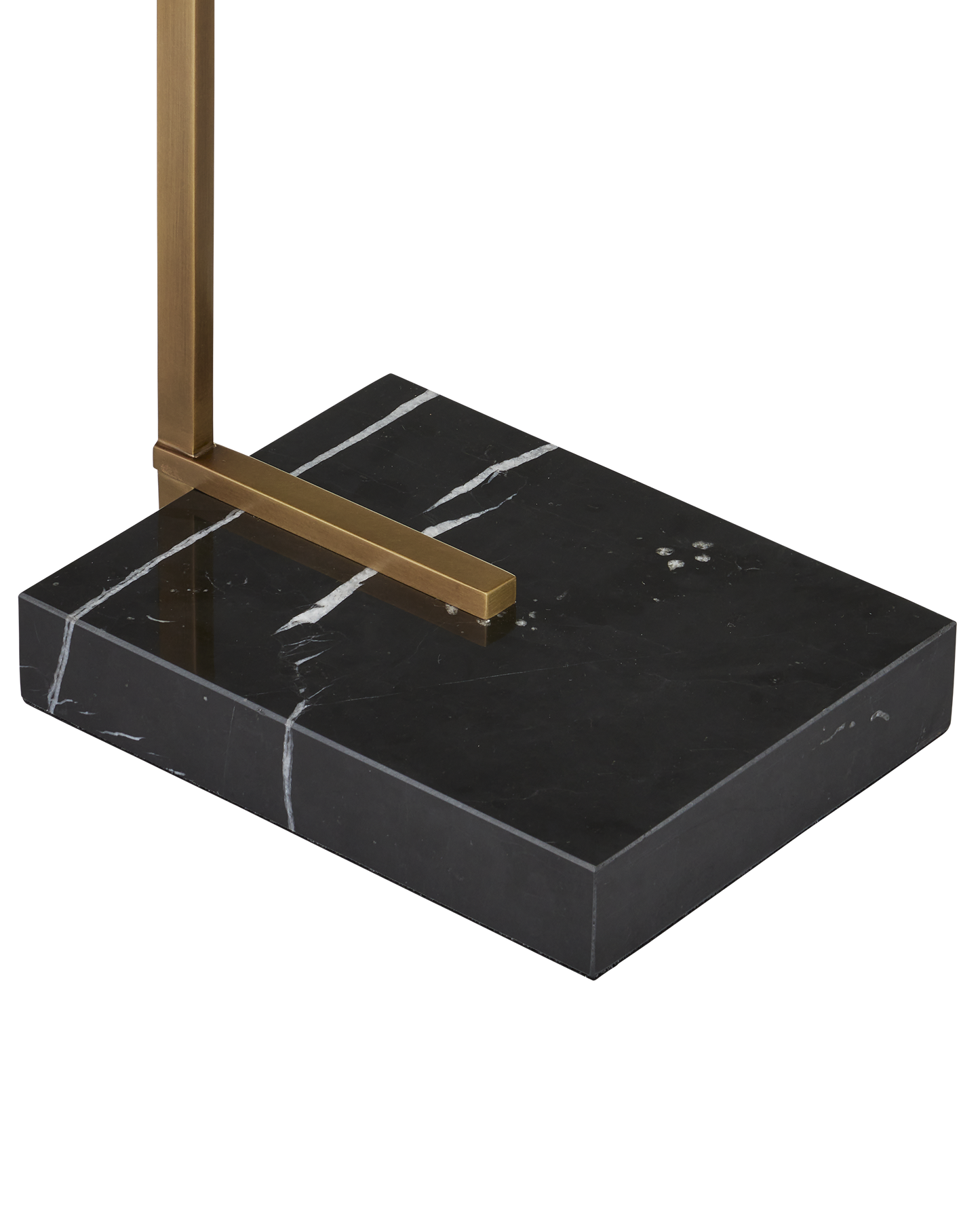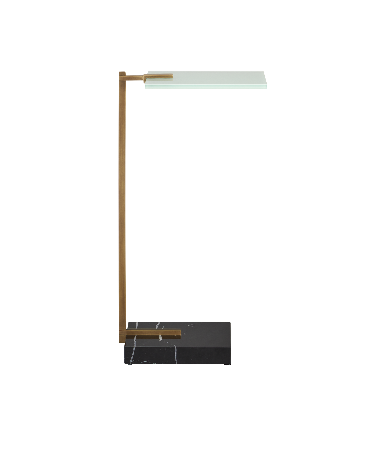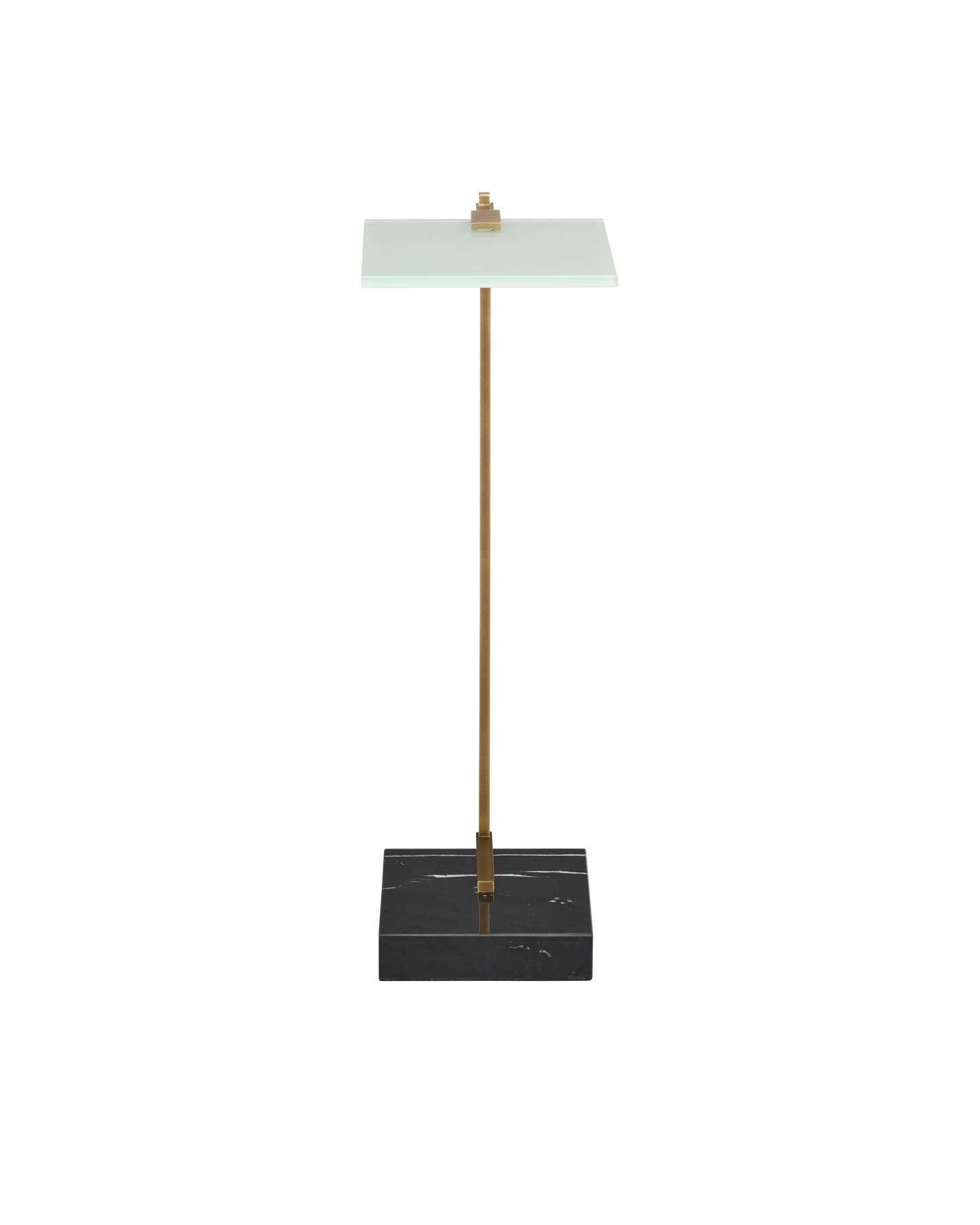 The Neil Black Drinks Table has a minimalist arm in an antique brass finish set within a black marble base that extends its frosted glass top. This is one of the Currey & Company offerings that is versatile due to its petite size and stylistic notes that hint at mid-century modern.