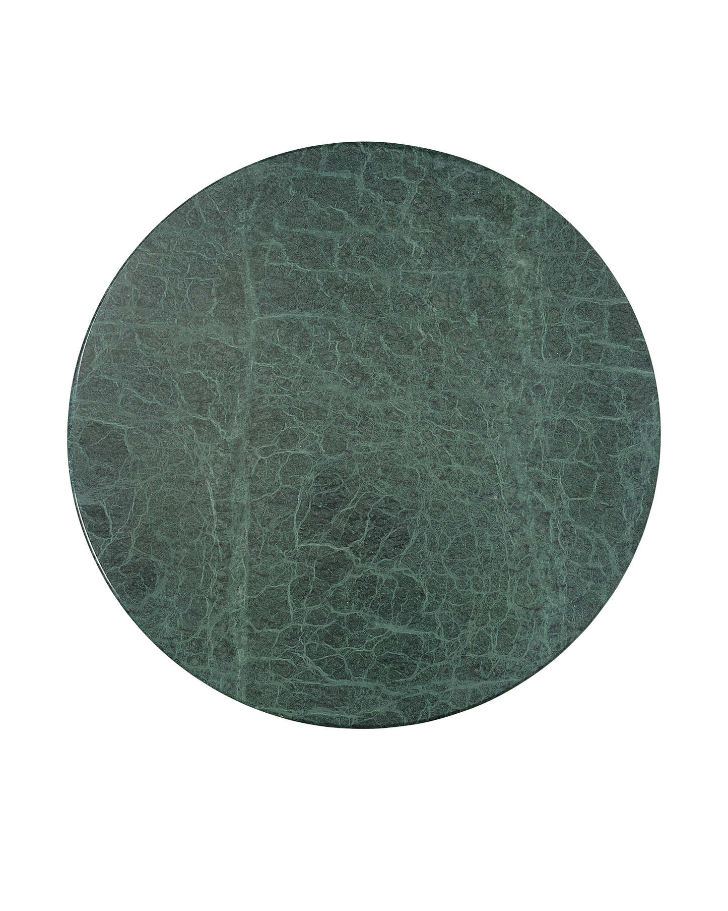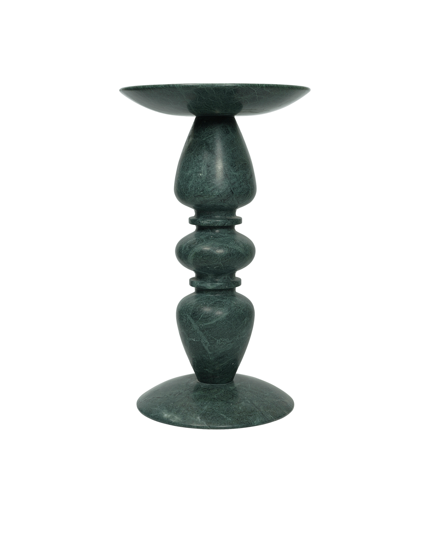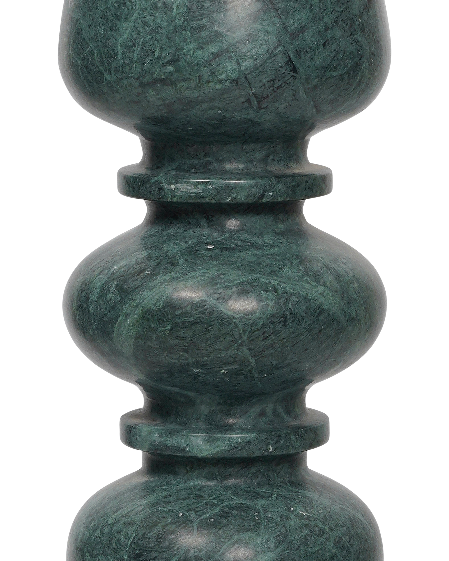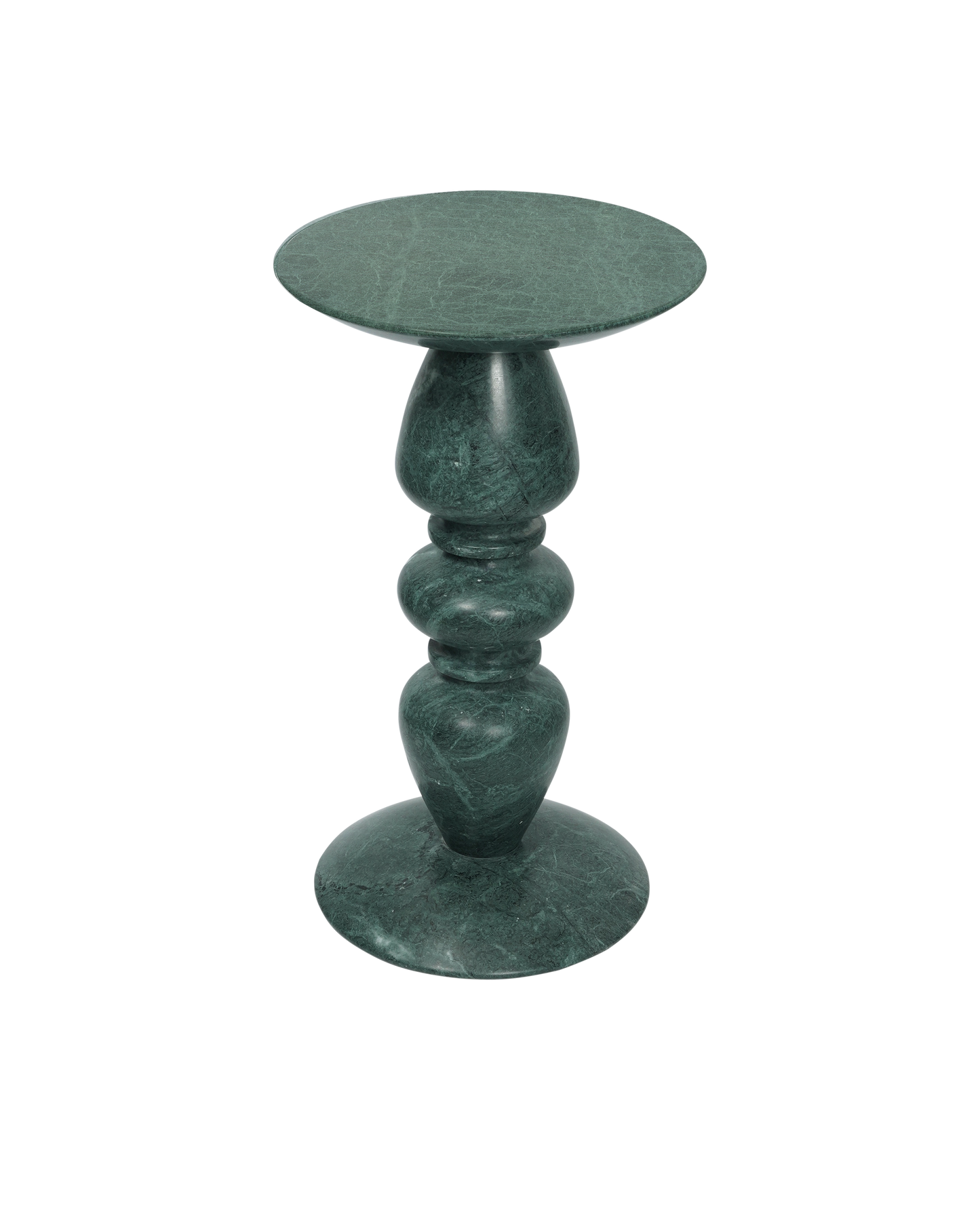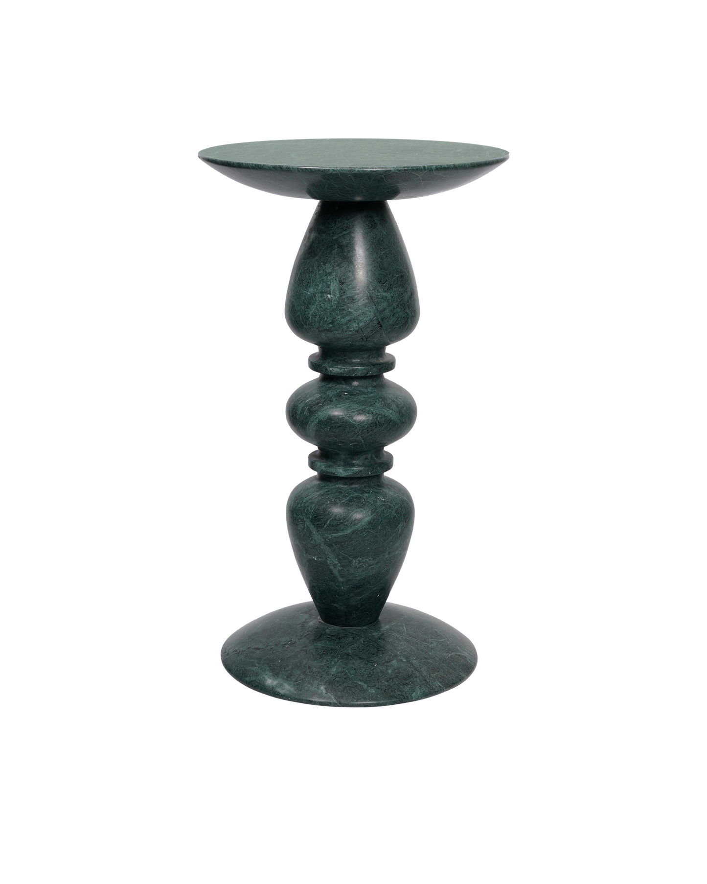 The Nubia Green Accent Table is like a beautiful chess piece with its turned column rising a round base that echoes the shape of the top. The steep bullnose on the underside of the top is also repeated, in reverse, on the base. Because this accent table is made of natural evergreen marble, the veining on each one will be unique. The top, base, and column are shipped together in three pieces.
