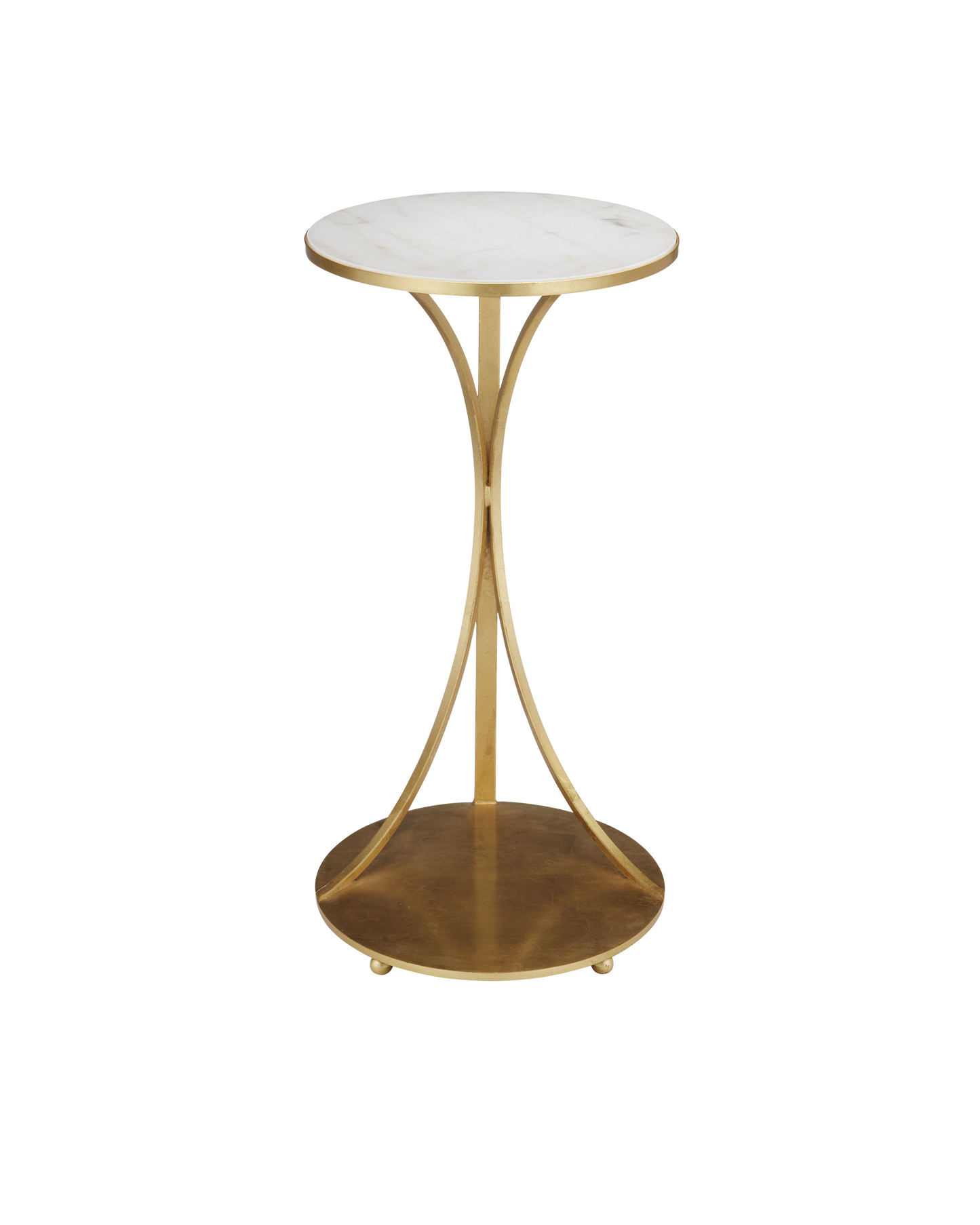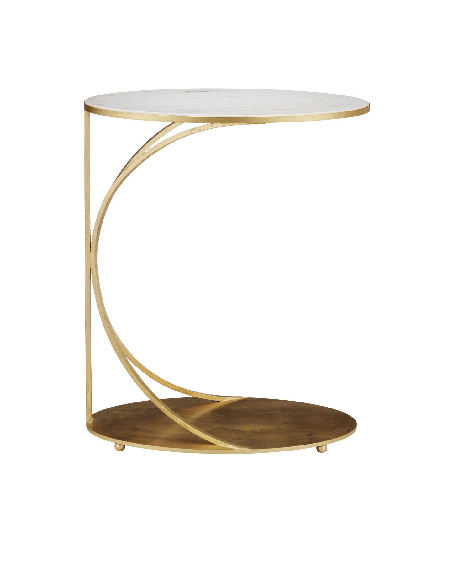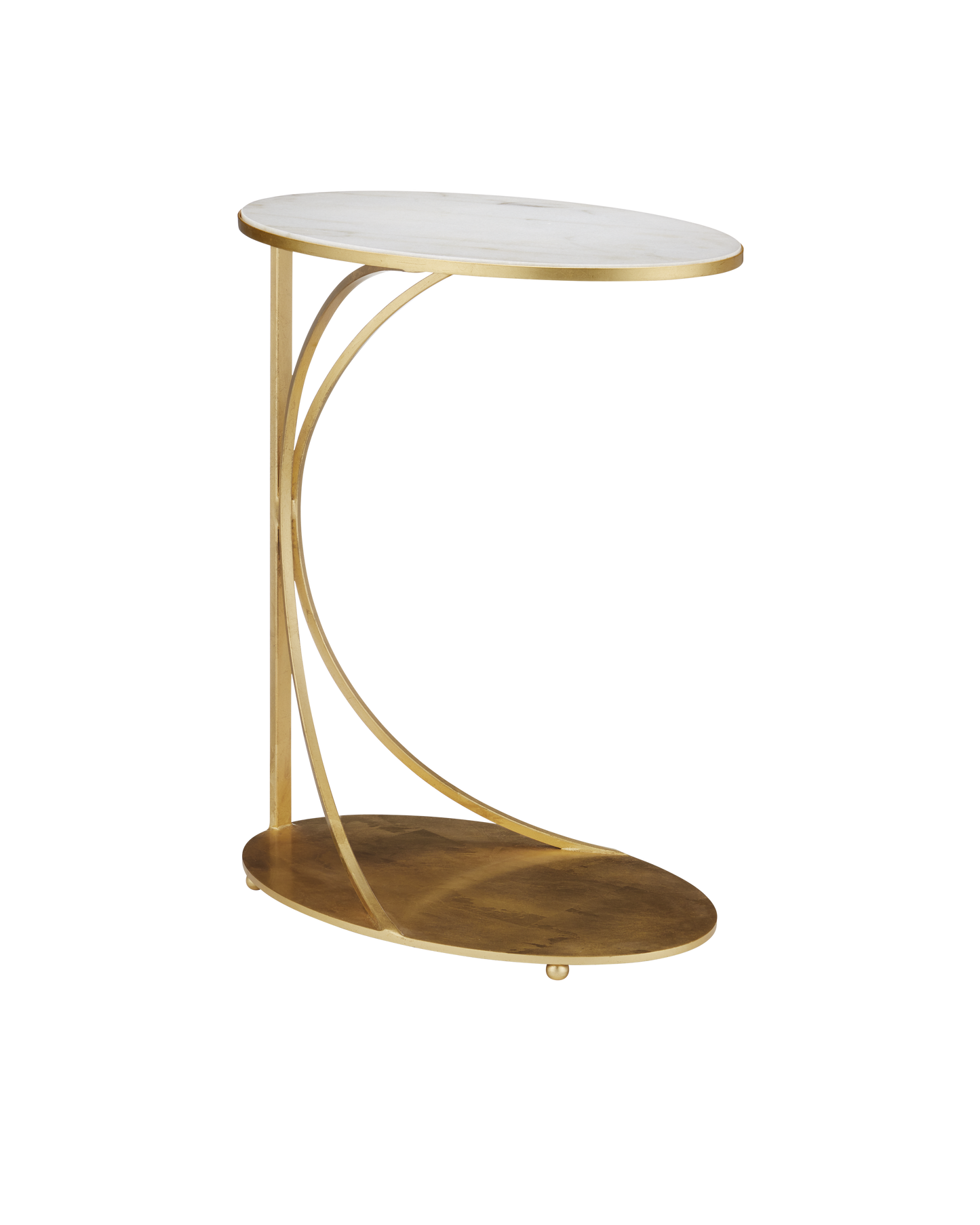 The Orla C Table is a gold cantilever table with delicate lines. Thin ribs of metal rise up from the oval base to support the oval top. The luminous gold leaf finish on the metal contrasts the crisp inset white marble top. The base has tiny ball feel that lift it slightly off the floor.