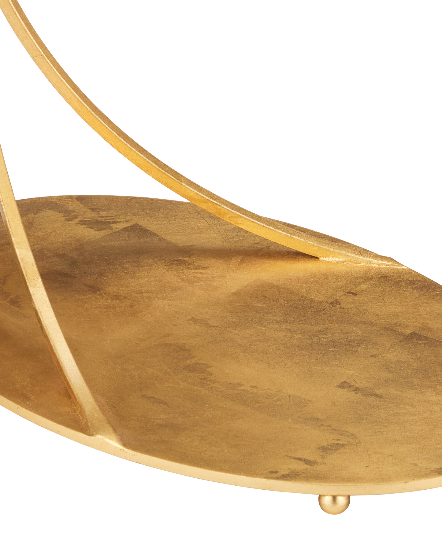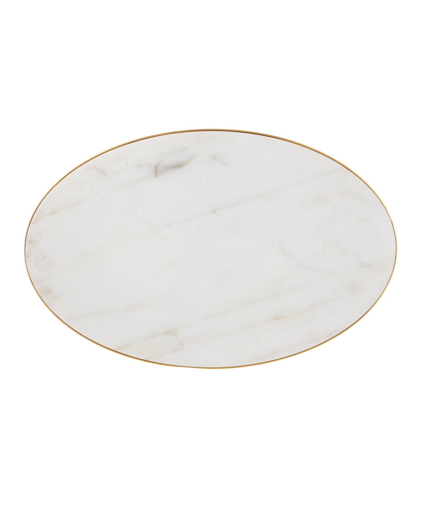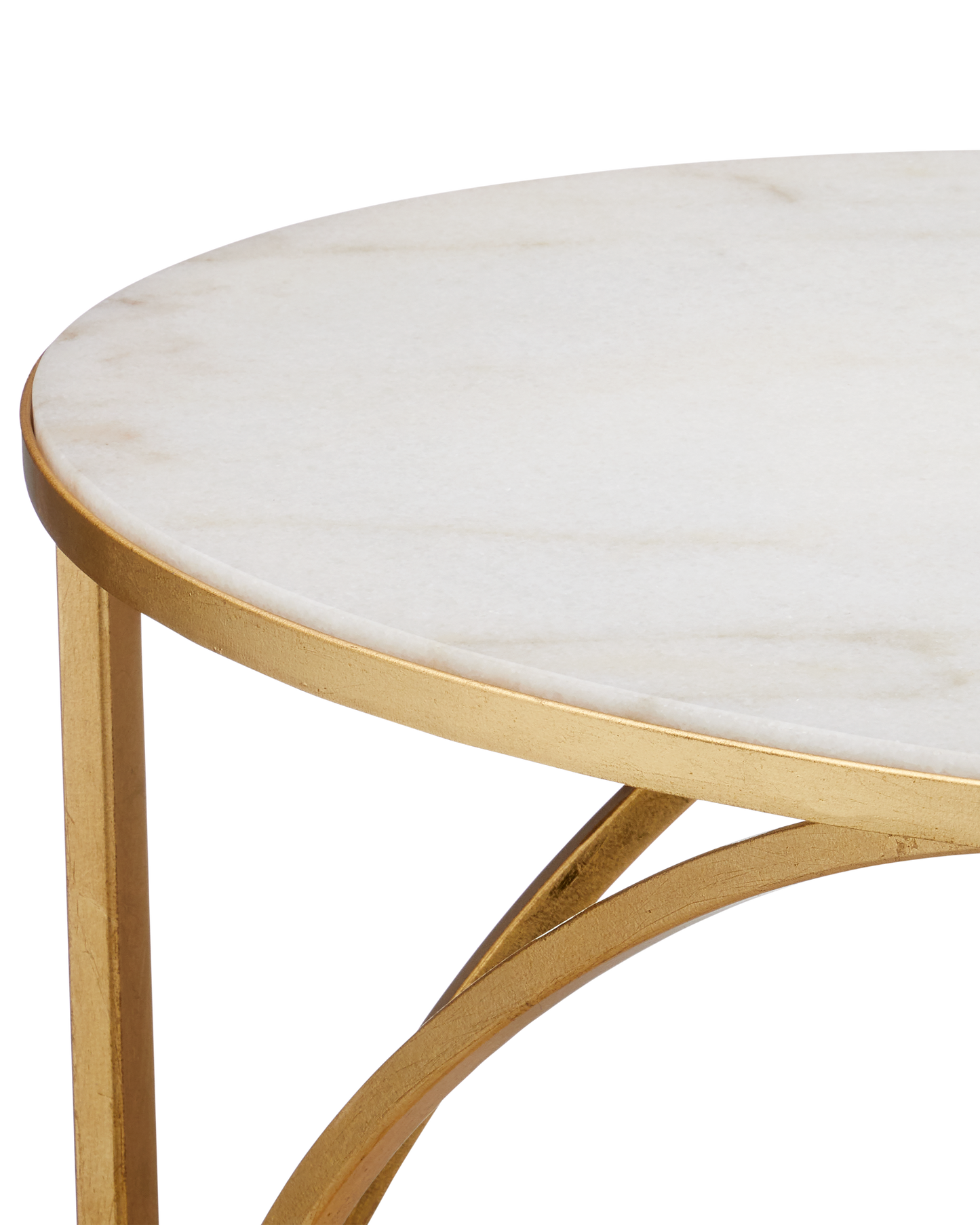 The Orla C Table is a gold cantilever table with delicate lines. Thin ribs of metal rise up from the oval base to support the oval top. The luminous gold leaf finish on the metal contrasts the crisp inset white marble top. The base has tiny ball feel that lift it slightly off the floor.