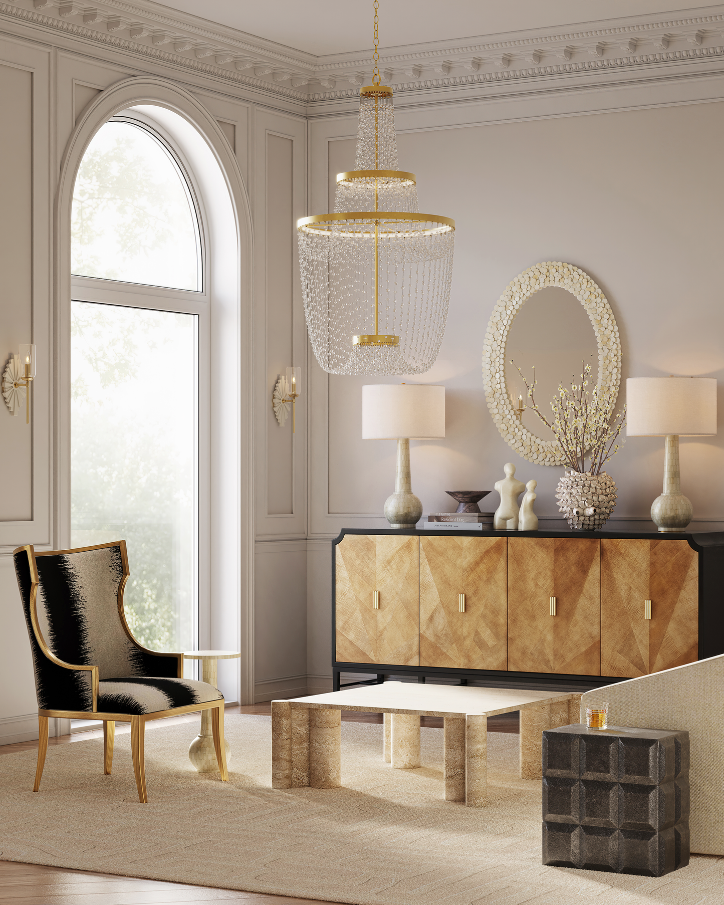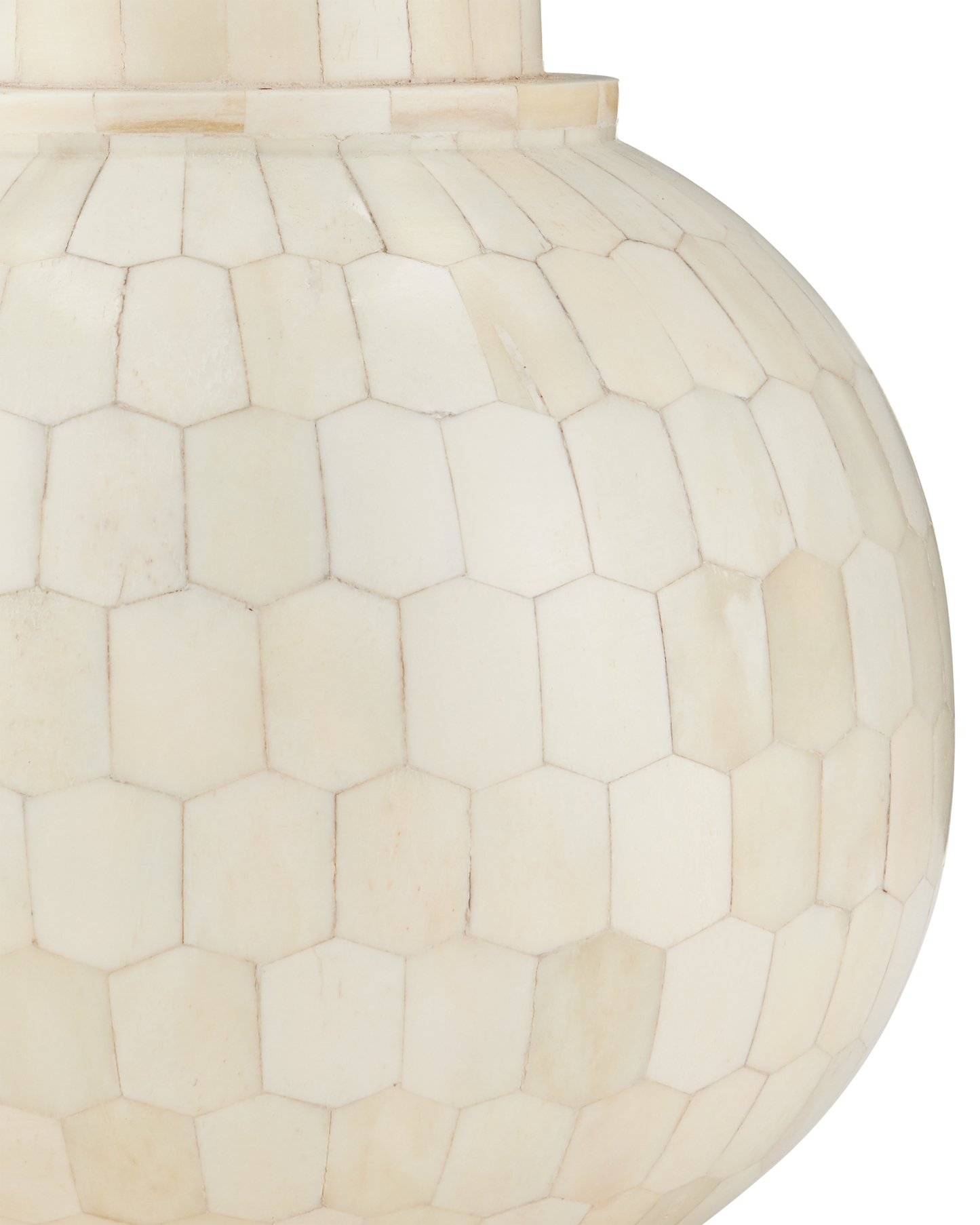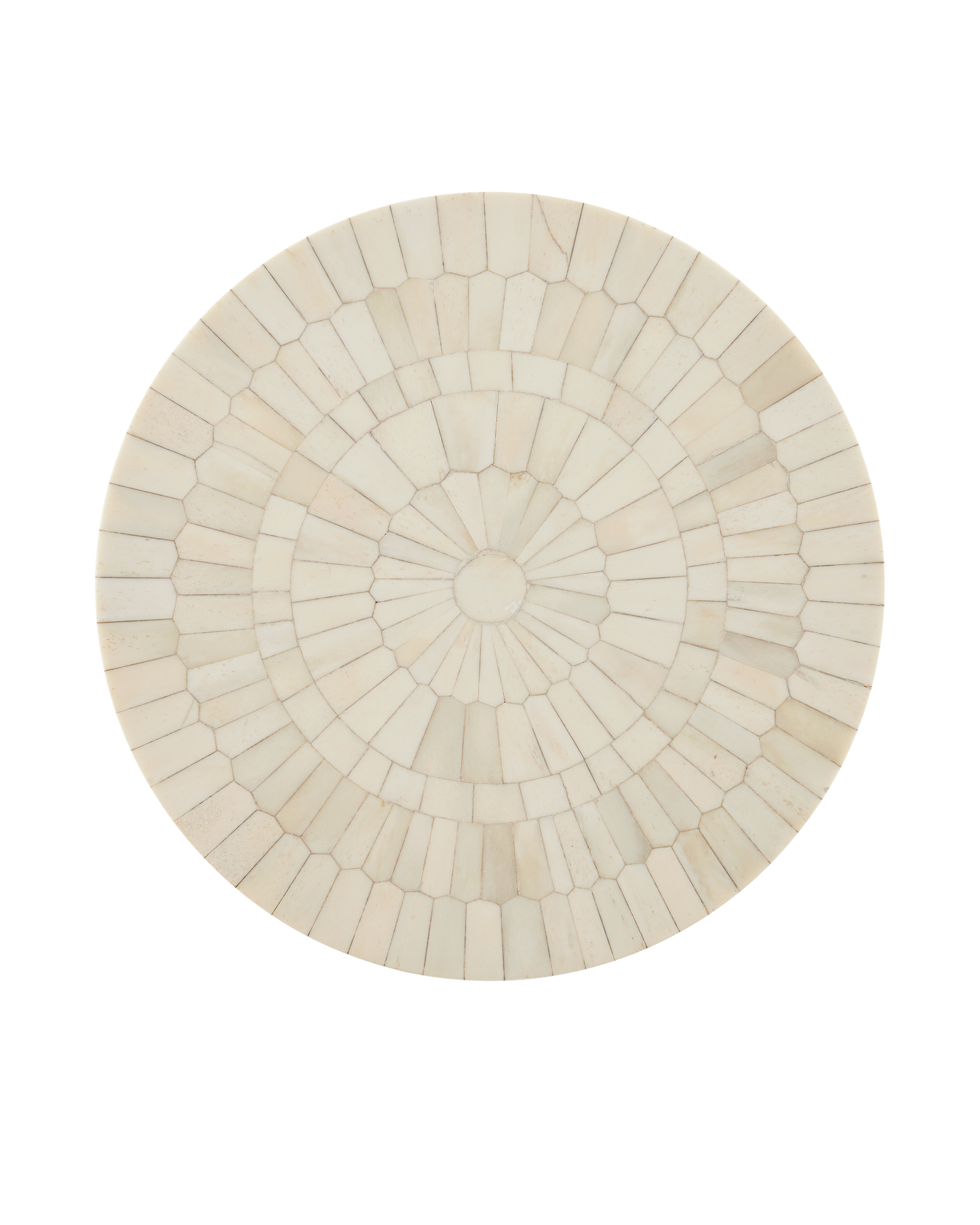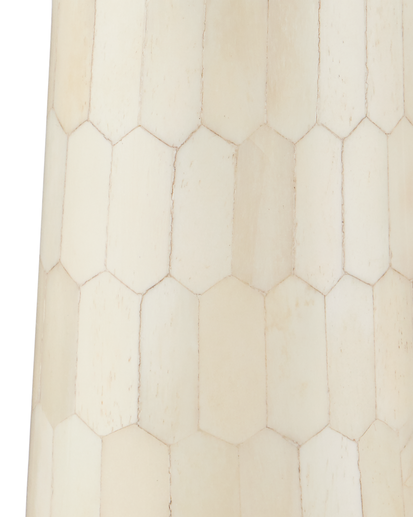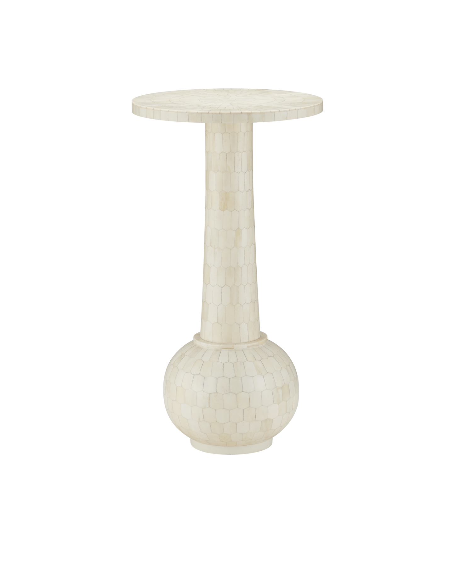 The Osa Drinks Table is a work of art, with its surface covered in over 400 pieces of natural bone that were ground into picket-tile shapes before being applied. The precision required to place the pieces so perfectly is a painstaking process. The plinth base on which the ivory drinks table sits is also covered in bone.
