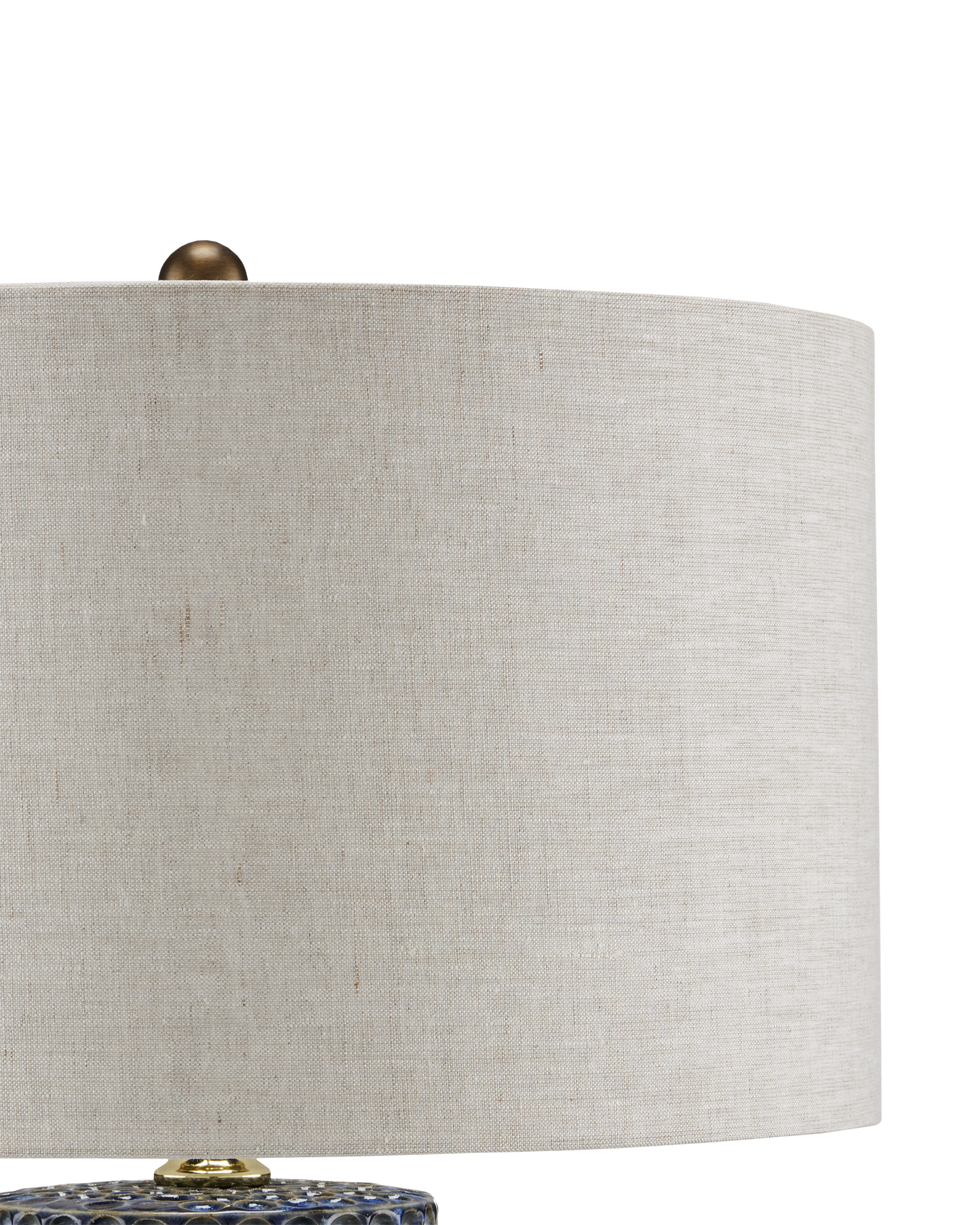 The Polka Dot Blue Table Lamp has a columnar ceramic body with a flowing pattern of circular shapes pressed into it, creating drifts of polka dots. Covered in a reactive glaze, the navy blue table lamp has added depth and texture when a brighter blue color shows through. A metal finial holds the natural linen shade in place.