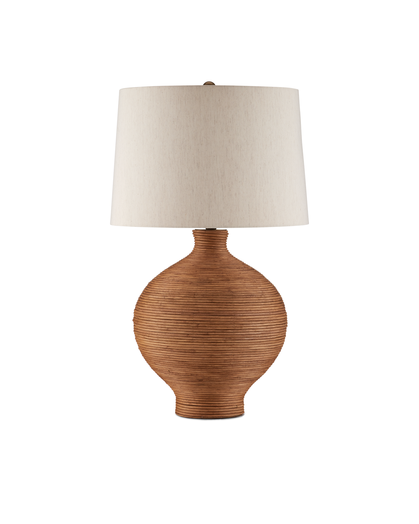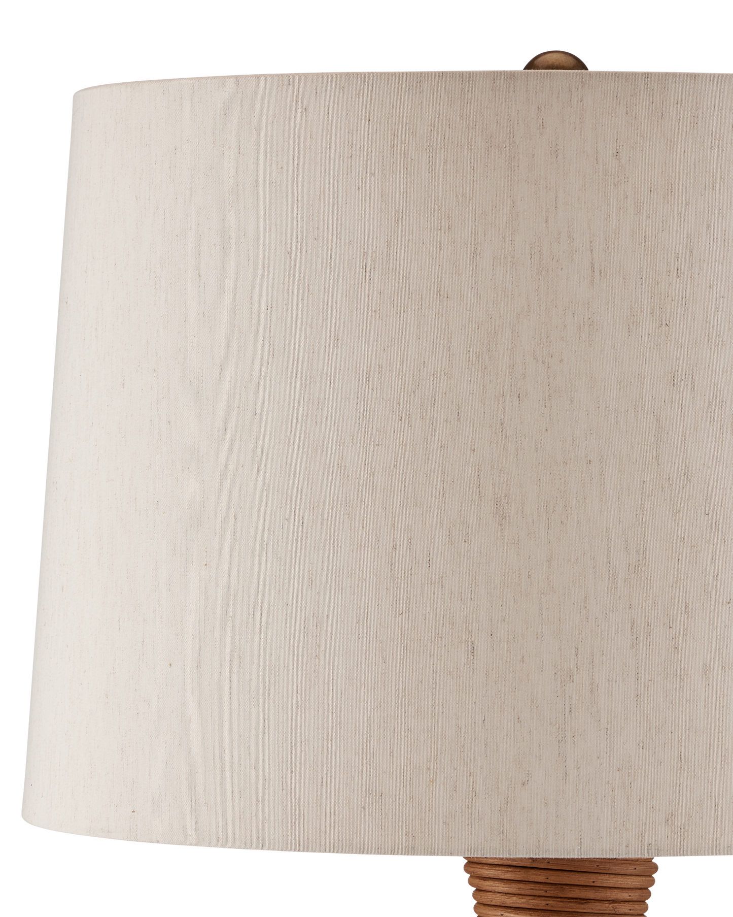The Susel Table Lamp is handmade through a painstaking process whereby artisans take strips of rattan without the skin and wrap it seamlessly around the contemporized ginger-jar shape. Achieving such a uniform linear feel is a true feat. Complementing the warmth of the natural material is the nubby shade, and the hardware and finial in an antique brass finish.