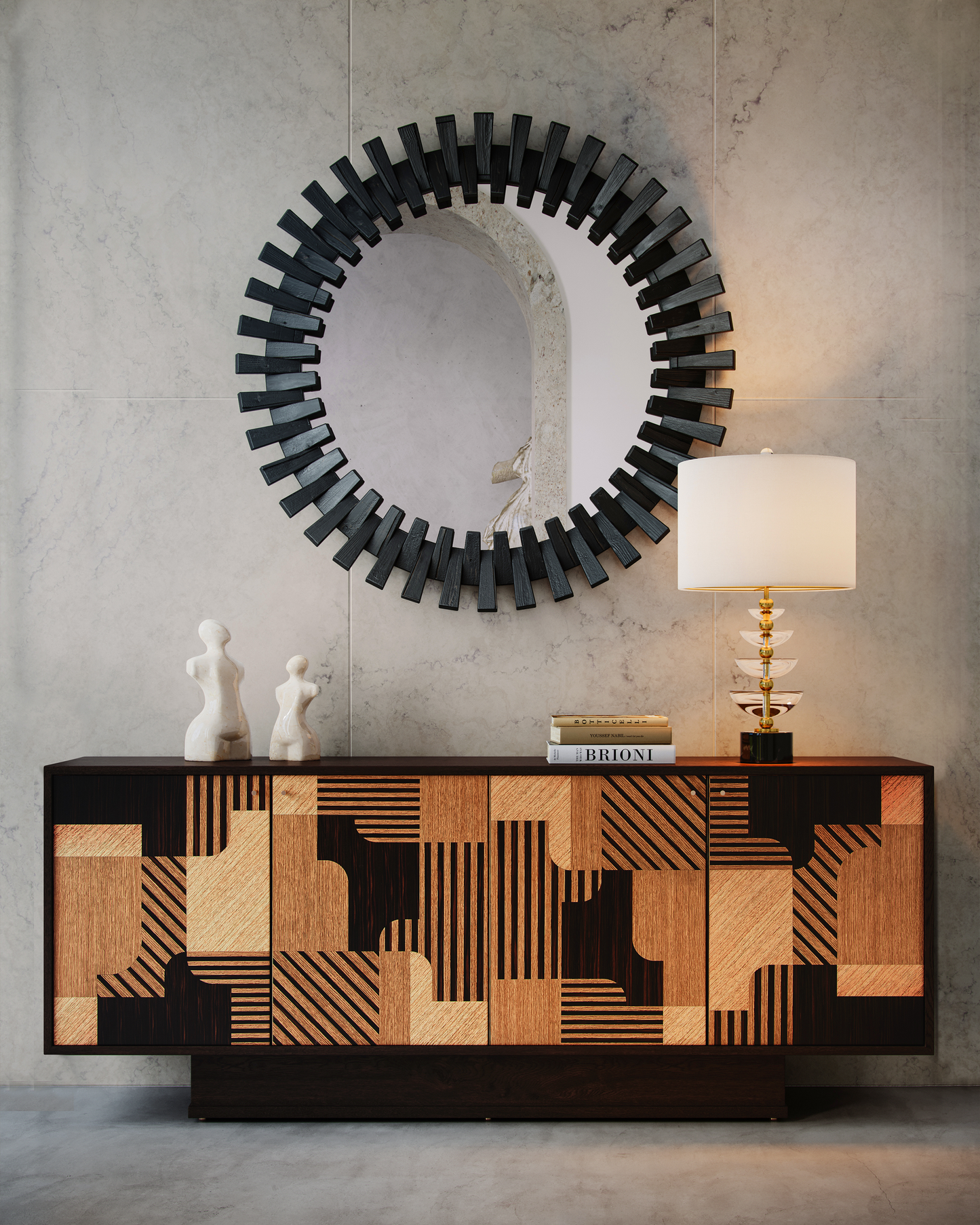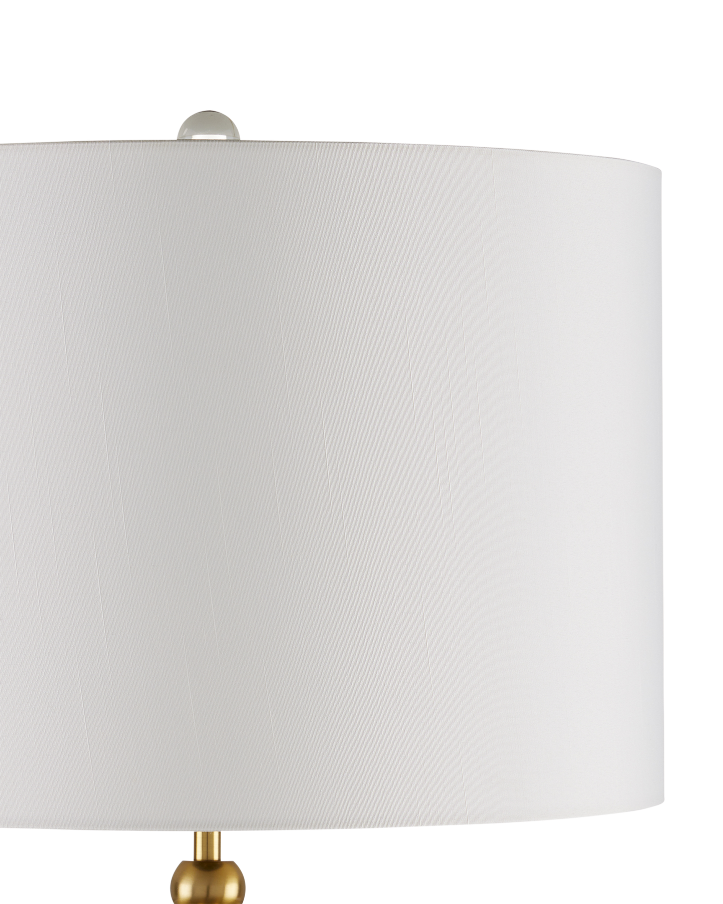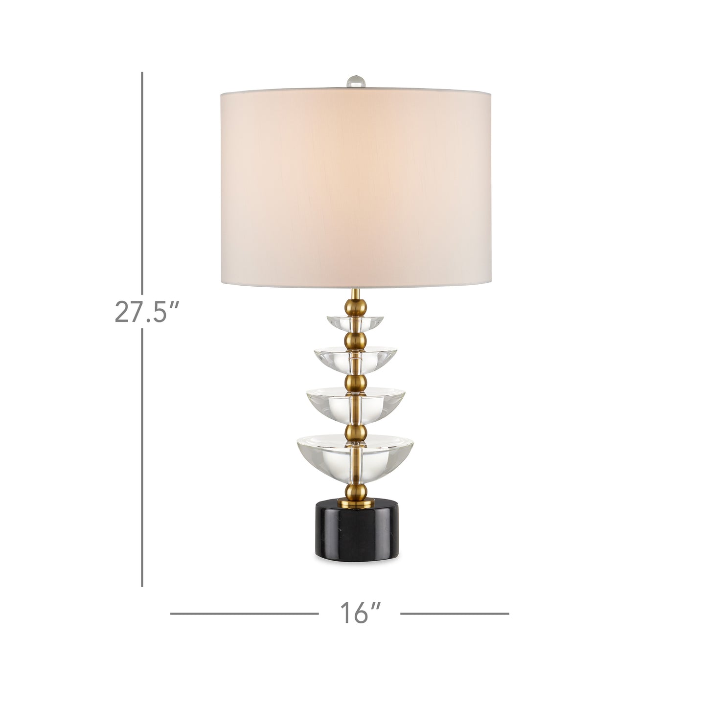 The Waterfall Table Lamp features an articulated stem fitted with optic crystal cup-like discs that glow when the lights are switched on. Inspired by a fountain, the design achieves perfect symmetry, creating a sense of modern sophistication. The lamp sits atop a black marble base, with the clear shapes separated by metal globes in a brass finish, and is topped with an off-white shantung shade.